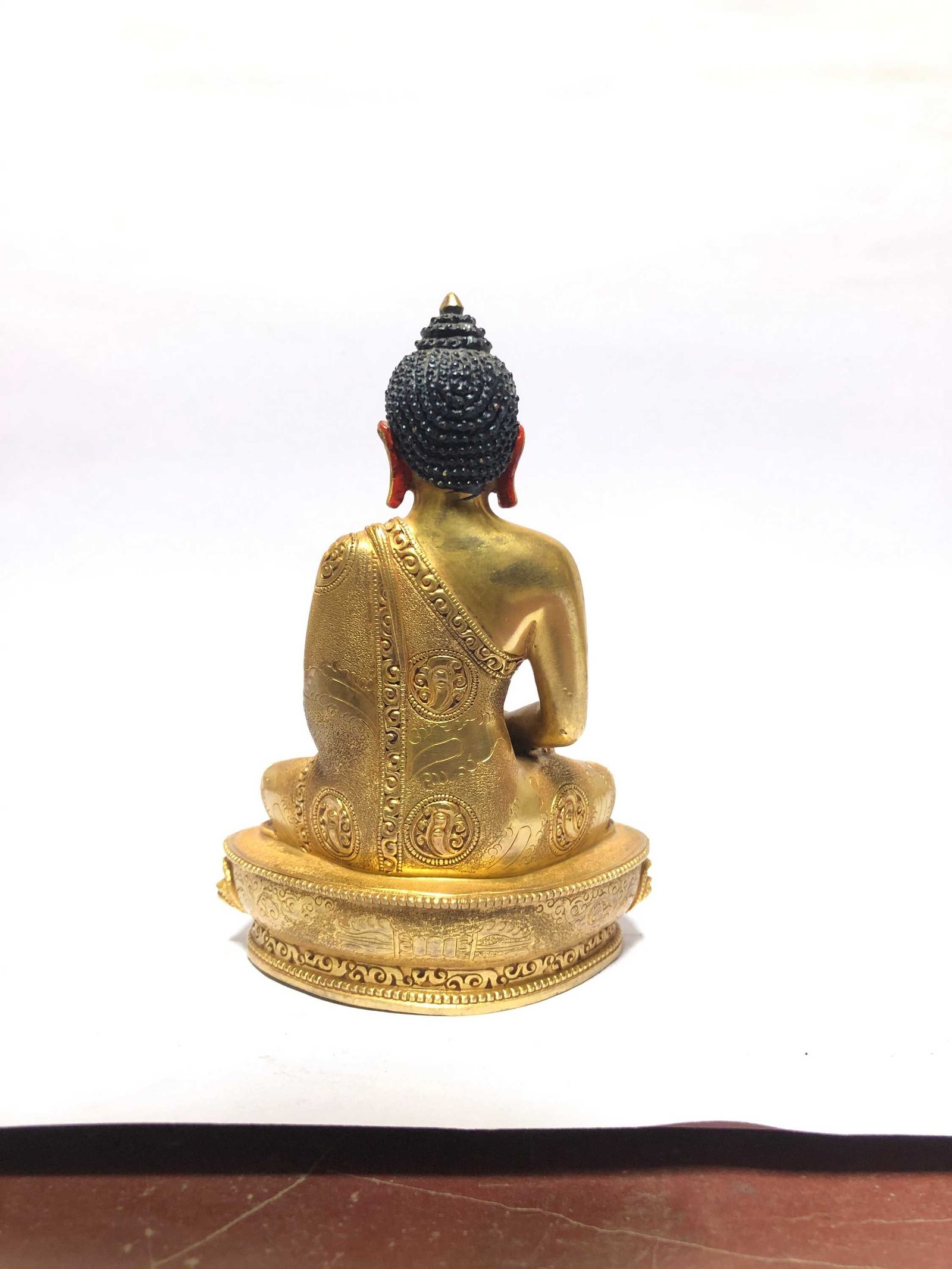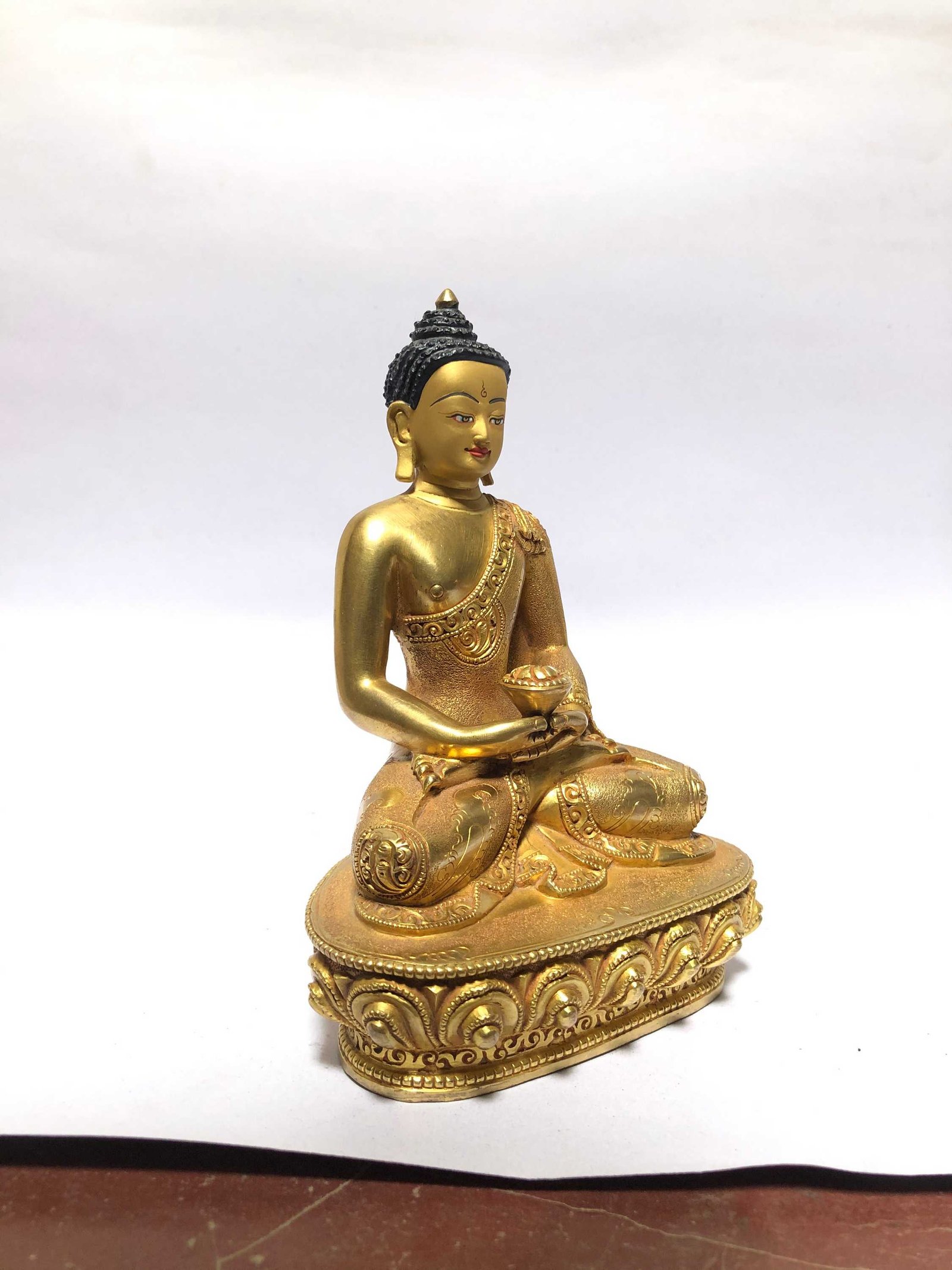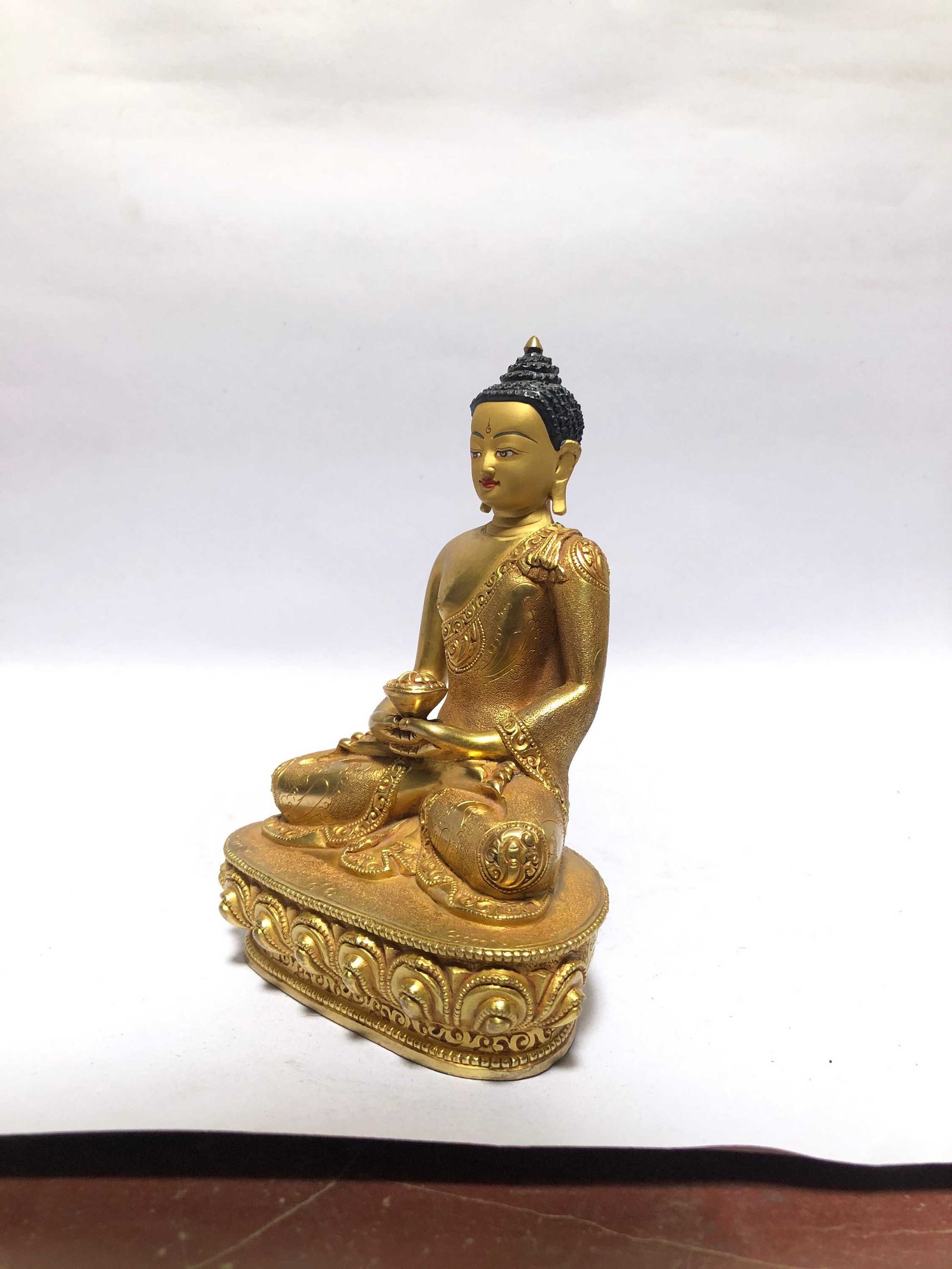This Amitabha Buddha is finished with full gold plating. also known as mercury gold plating or fire gold plating. This traditional technique involves the application of a genuine layer of gold onto the Amitabha Buddha. Referred to as mercury gold plating, it is considered the correct and authentic form of gold plating in Nepal. Despite being more expensive than electroplating, this traditional mercury gold plating is gaining popularity again in Nepal. People are drawn to its authenticity, longevity, and the unmatched beauty it brings to the Amitabha Buddha. The resurgence of interest in this traditional form of gold plating reflects a growing appreciation for the craftsmanship and cultural heritage of Nepal Read More