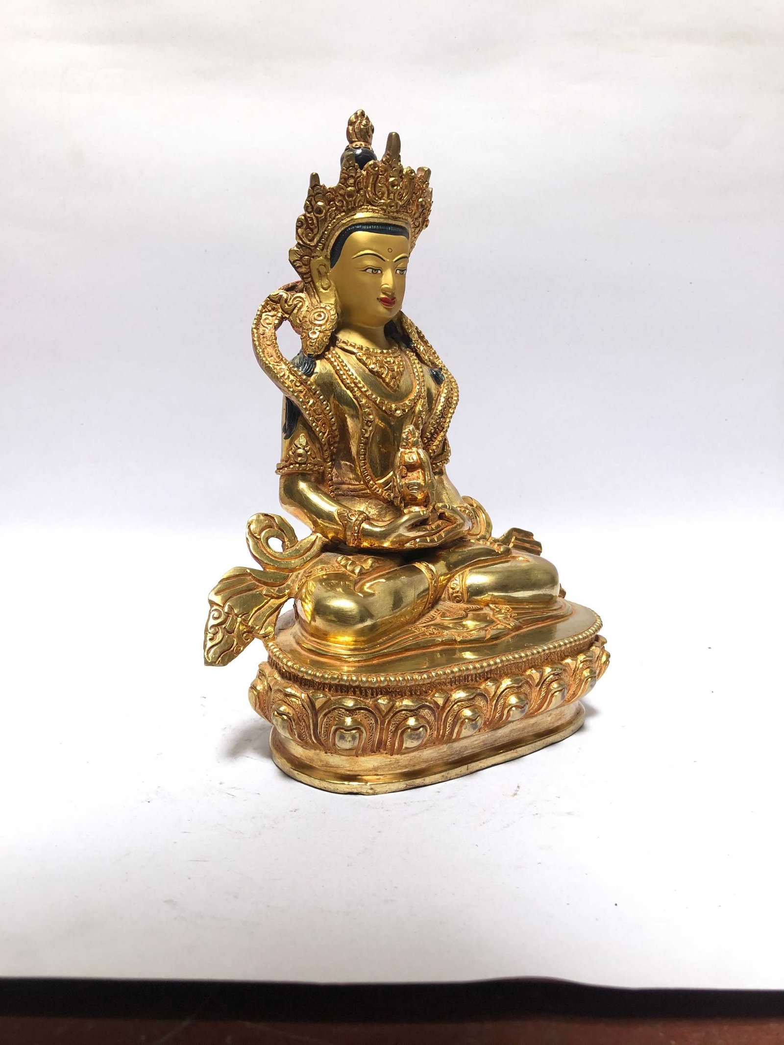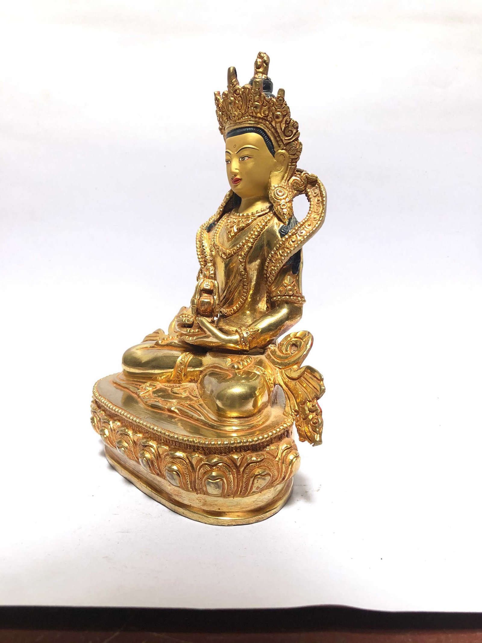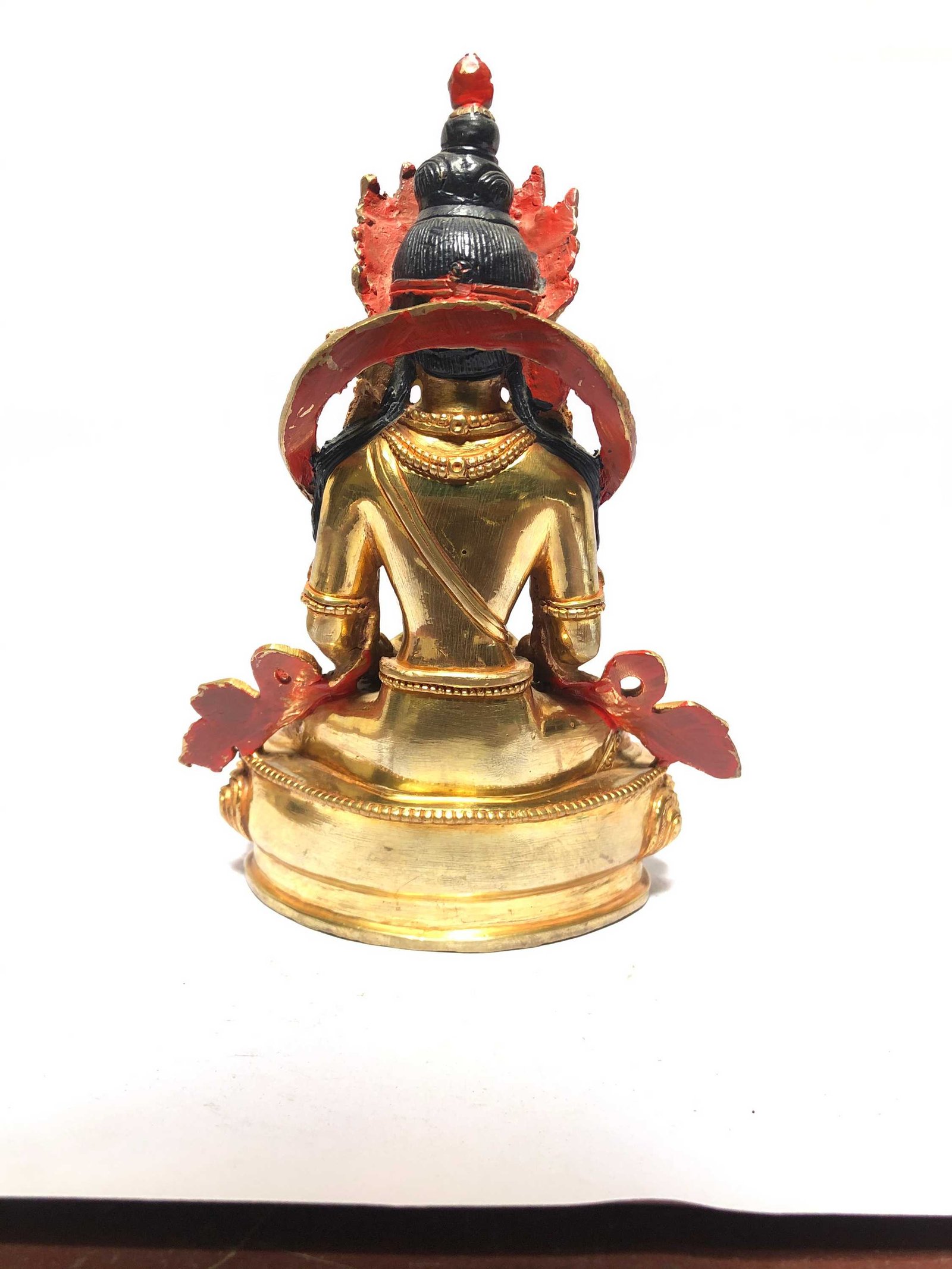 This Amitabha Buddha is finished with full gold plating. also known as mercury gold plating or fire gold plating. This traditional technique involves the application of a genuine layer of gold onto the Amitabha Buddha. Referred to as mercury gold plating, it is considered the correct and authentic form of gold plating in Nepal. Despite being more expensive than electroplating, this traditional mercury gold plating is gaining popularity again in Nepal. People are drawn to its authenticity, longevity, and the unmatched beauty it brings to the Amitabha Buddha. The resurgence of interest in this traditional form of gold plating reflects a growing appreciation for the craftsmanship and cultural heritage of Nepal Read More