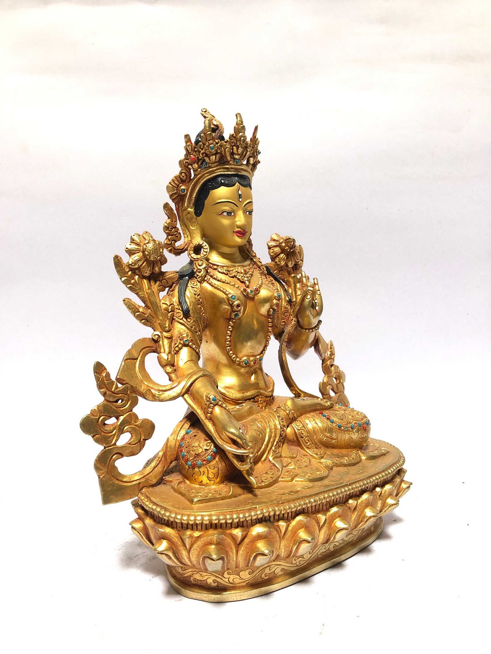 The face of White Tara is painted with gold to enhance its significant features, particularly the eyes, and lips. This detailed painting is essential as it brings forth the crucial attributes of the expression of eyes and lips that metal carving alone cannot capture.