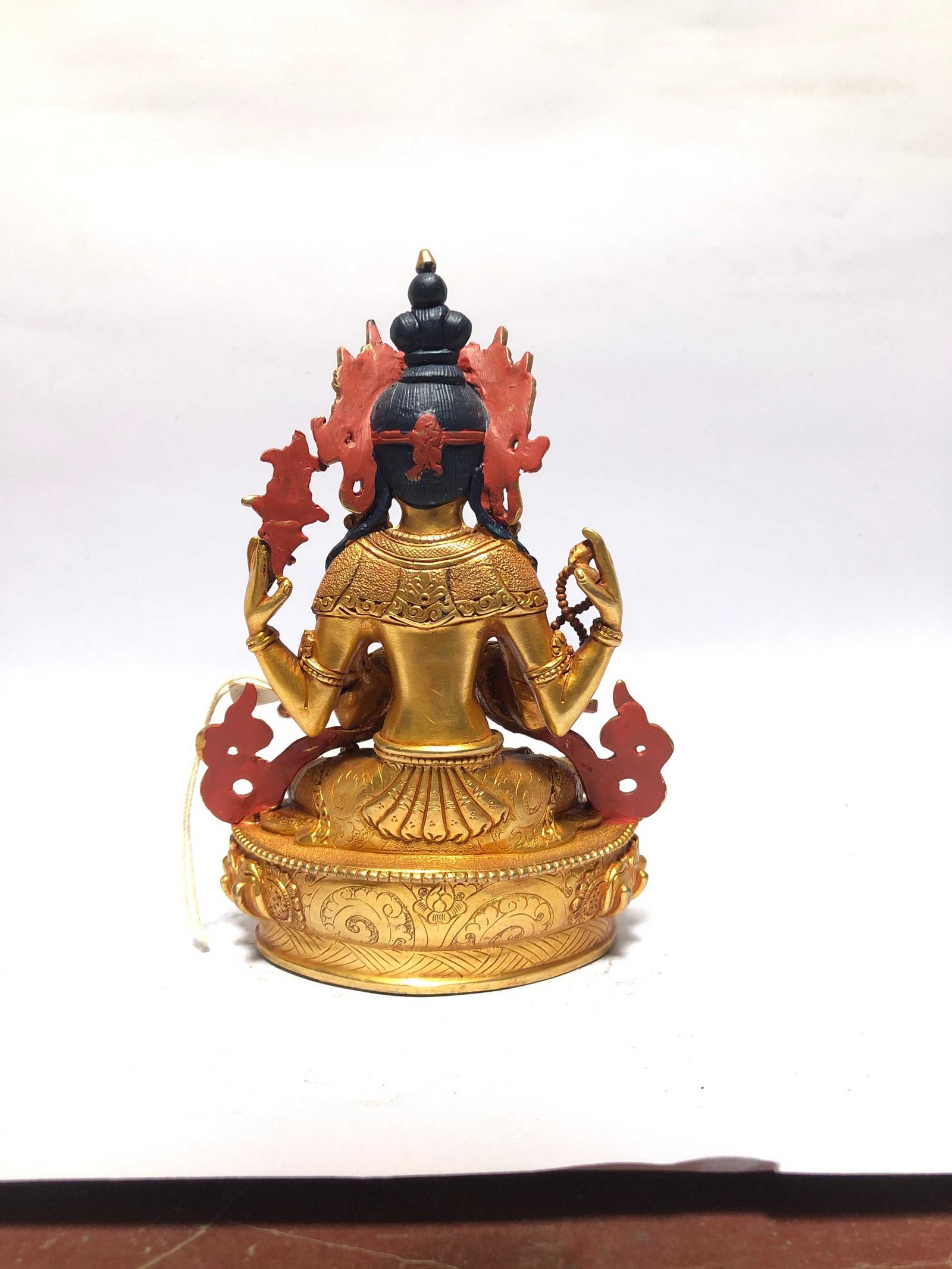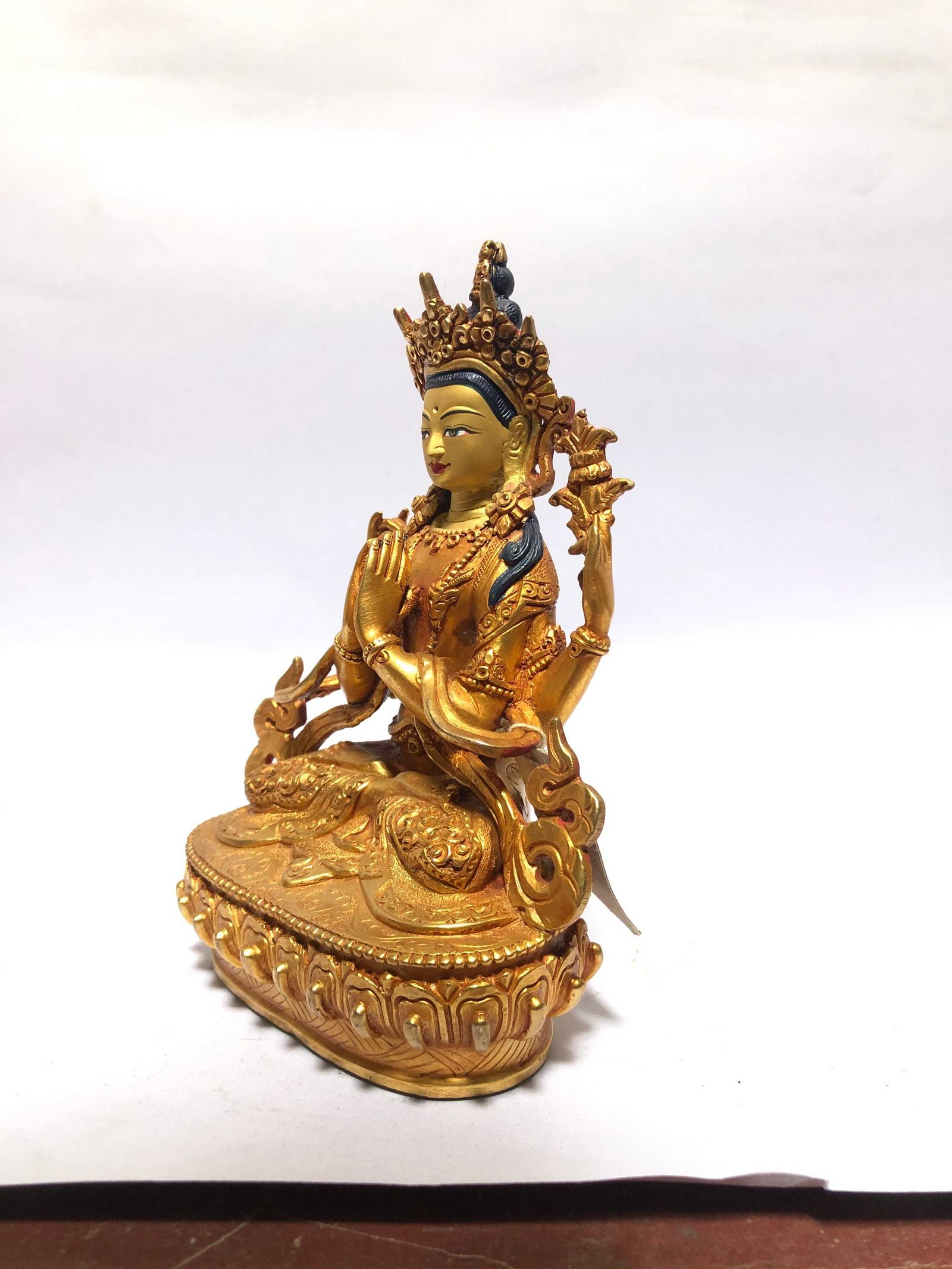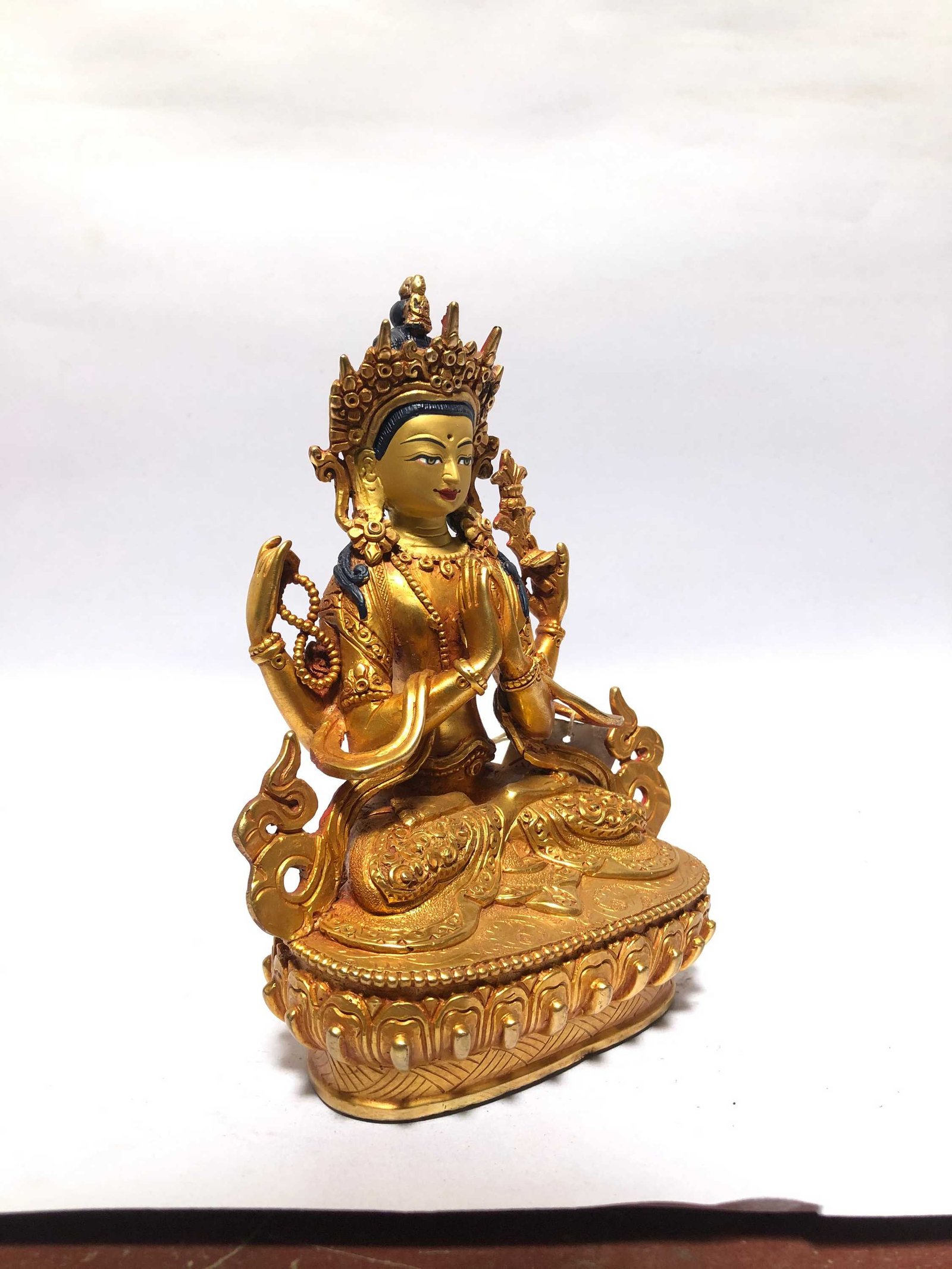 This Chenrezig is finished with full gold plating. also known as mercury gold plating or fire gold plating. This traditional technique involves the application of a genuine layer of gold onto the Chenrezig. Referred to as mercury gold plating, it is considered the correct and authentic form of gold plating in Nepal. Despite being more expensive than electroplating, this traditional mercury gold plating is gaining popularity again in Nepal. People are drawn to its authenticity, longevity, and the unmatched beauty it brings to the Chenrezig. The resurgence of interest in this traditional form of gold plating reflects a growing appreciation for the craftsmanship and cultural heritage of Nepal Read More