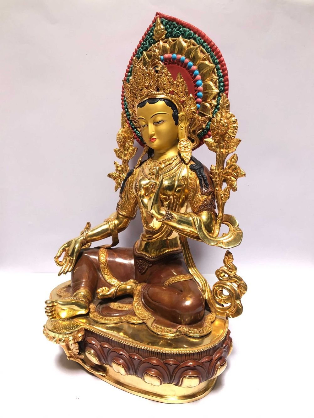 Monastery Quality Buddhist Statue of Green Tara Full Fire Gold Plated, Painted Face , Goddess of Compassion, Protection, and Swift Action