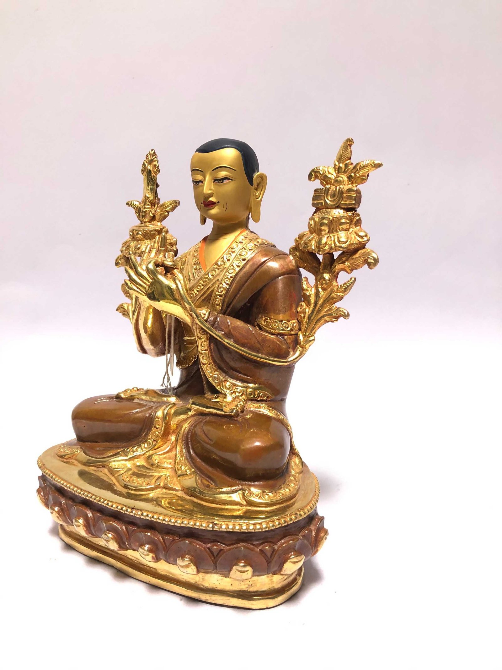 This Tsongkhapa is finished with full gold plating. also known as mercury gold plating or fire gold plating. This traditional technique involves the application of a genuine layer of gold onto the Tsongkhapa. Referred to as mercury gold plating, it is considered the correct and authentic form of gold plating in Nepal. Despite being more expensive than electroplating, this traditional mercury gold plating is gaining popularity again in Nepal. People are drawn to its authenticity, longevity, and the unmatched beauty it brings to the Tsongkhapa. The resurgence of interest in this traditional form of gold plating reflects a growing appreciation for the craftsmanship and cultural heritage of Nepal Read More