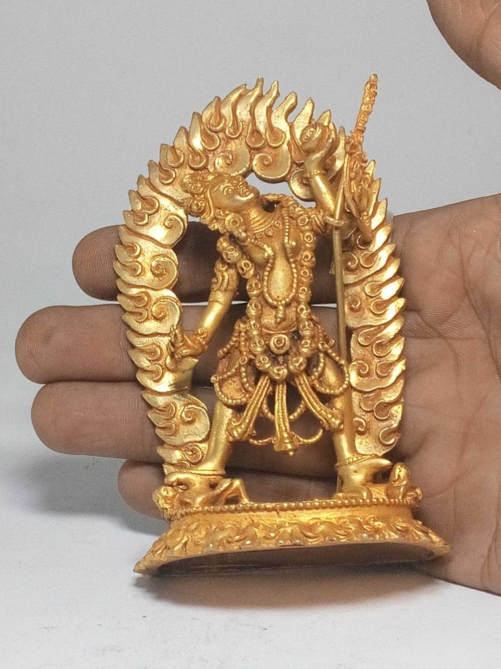 The Vajrayogini has been crafted using the Ceramic mold casting process, a modern approach that provides an alternative to traditional methods such as the lost-wax system or rubber molding. Also referred to as ceramic molding, this technique involves the creation of a ceramic mold to cast the statue. The process begins by making a precise and detailed wax model of the desired sculpture. The wax model is then coated with layers of ceramic material, creating a sturdy mold. Once the mold is complete, it is fired in a kiln, causing the wax to melt and escape, leaving behind a cavity that perfectly replicates the original sculpture. Molten metal is then poured into the mold, allowing it to fill the cavity and take on the desired form. Once cooled and solidified, the ceramic mold is carefully broken away, revealing the final metal statue. Read More