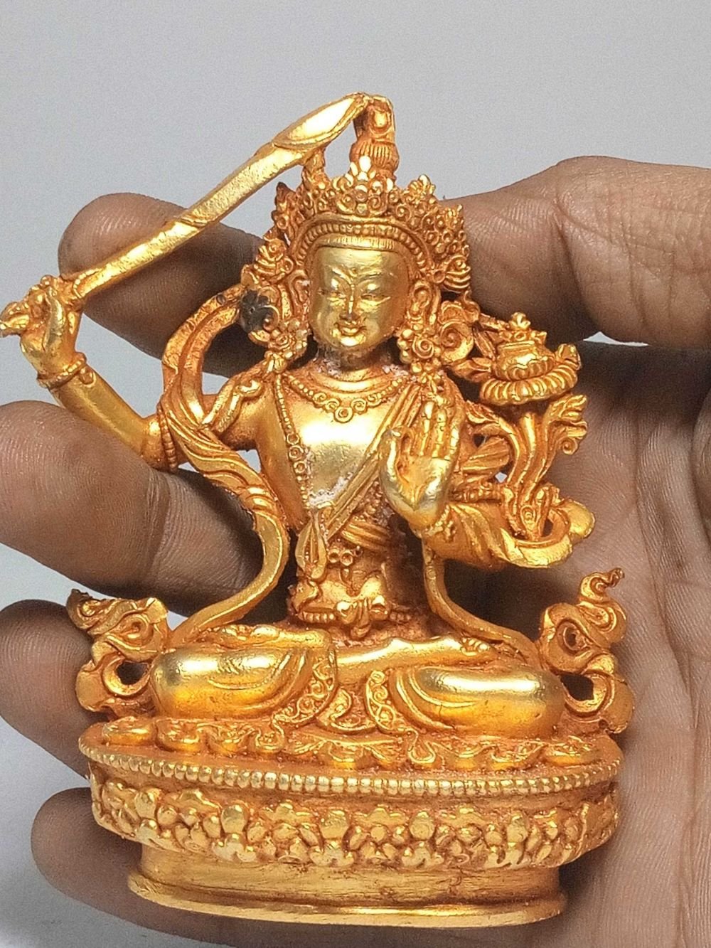 Nepali Small Statue of Manjushri, Full Gold Plated , Wisdom Buddha, cutting through ignorance with the sword of insight