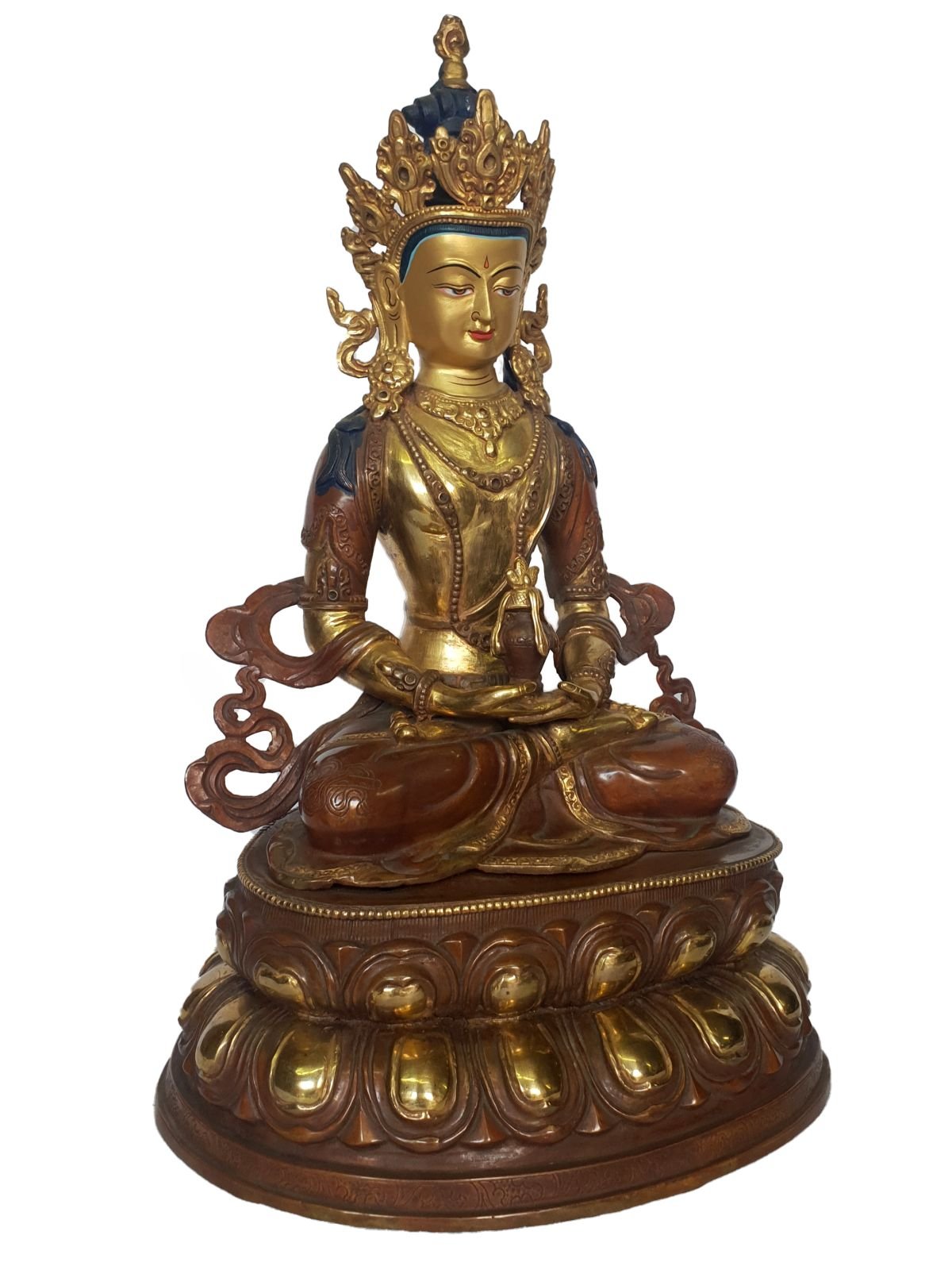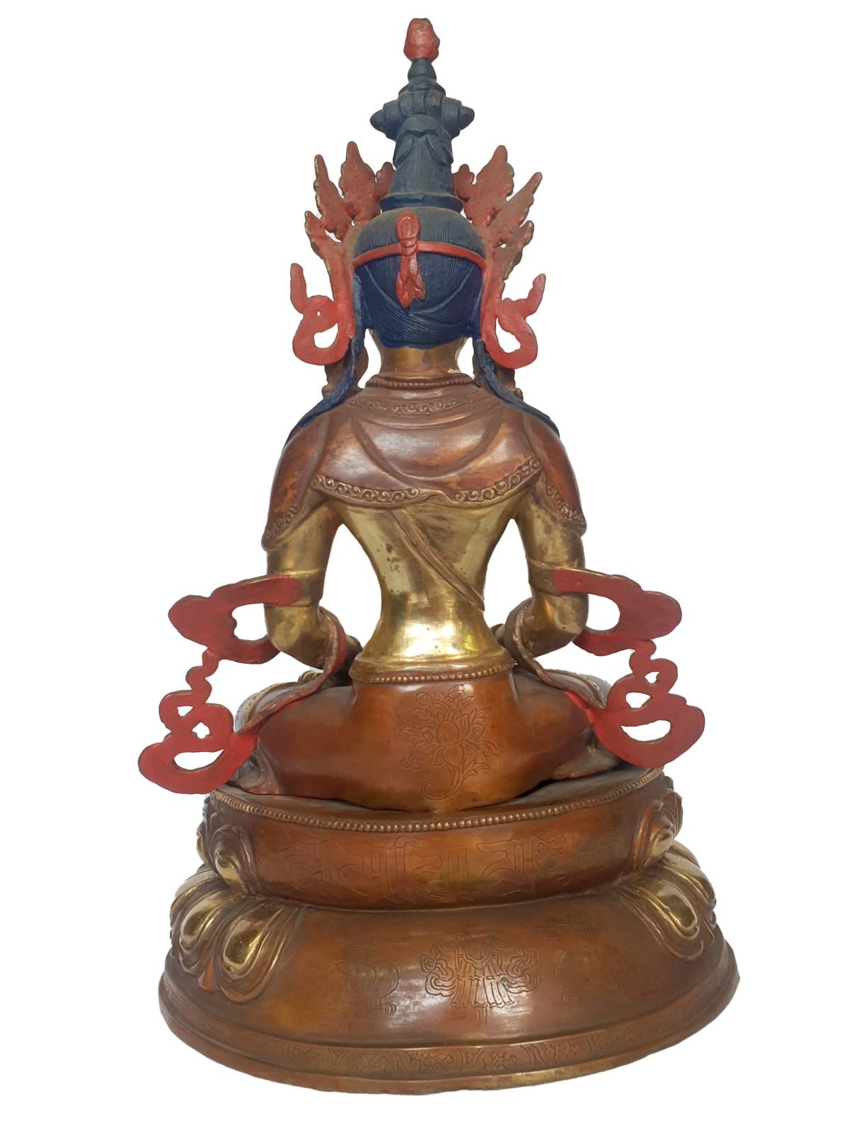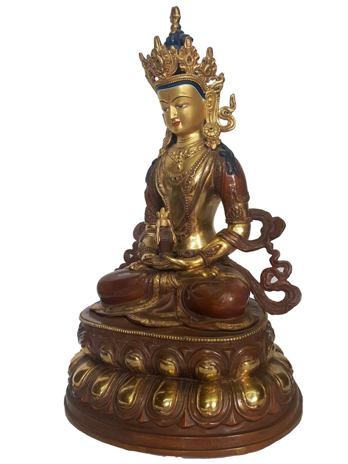 This Aparimita has a Partly gold-plated finish. Partly fire gold gilding, a common practice in Nepali handicrafts. This technique is skillfully employed by artisans to create intricate designs on various metal objects, including statues, jewelry, and decorative items. Through a process, a mask or resist is applied to safeguard specific areas from the gold plating. The object is then subjected to high temperatures, allowing the gold to beautifully adhere to exposed surfaces using a combination of heat and pressure.