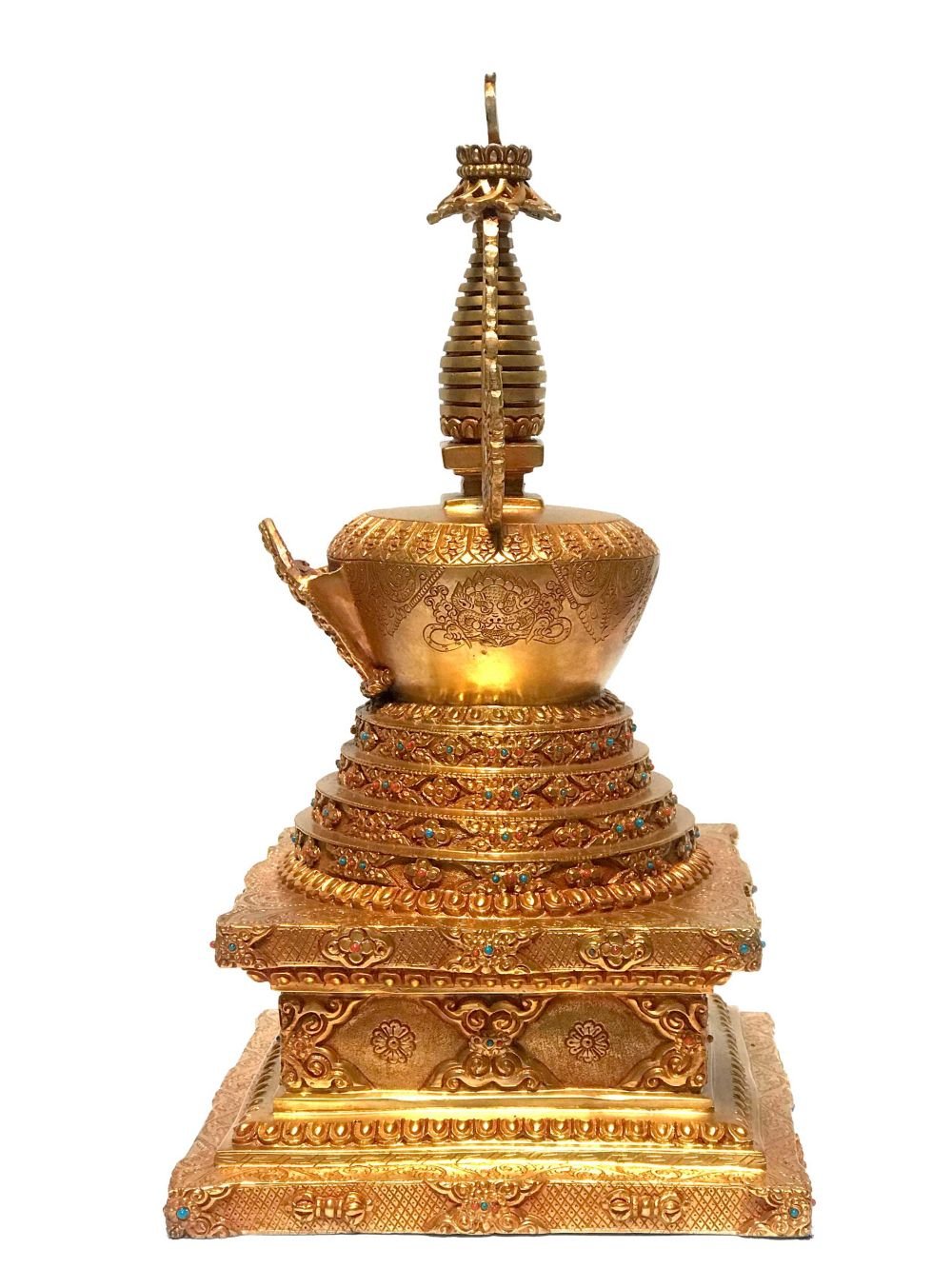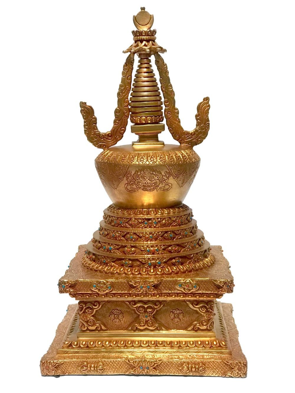 This Eight Stupa is finished with full gold plating. also known as mercury gold plating or fire gold plating. This traditional technique involves the application of a genuine layer of gold onto the Eight Stupa. Referred to as mercury gold plating, it is considered the correct and authentic form of gold plating in Nepal. Despite being more expensive than electroplating, this traditional mercury gold plating is gaining popularity again in Nepal. People are drawn to its authenticity, longevity, and the unmatched beauty it brings to the Eight Stupa. The resurgence of interest in this traditional form of gold plating reflects a growing appreciation for the craftsmanship and cultural heritage of Nepal Read More