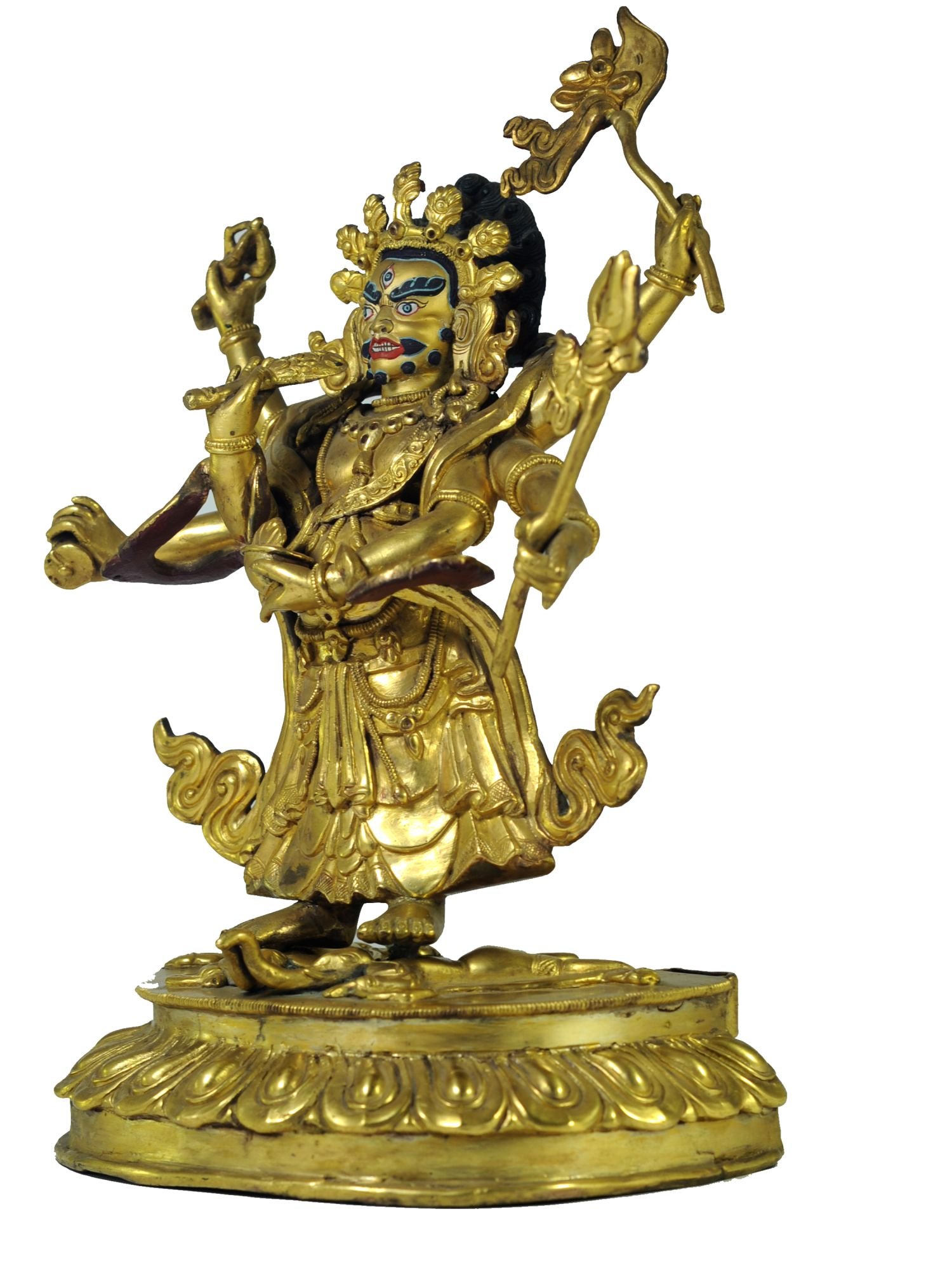 The face of White Mahakala is painted with gold to enhance its significant features, particularly the eyes, and lips. This detailed painting is essential as it brings forth the crucial attributes of the expression of eyes and lips that metal carving alone cannot capture.