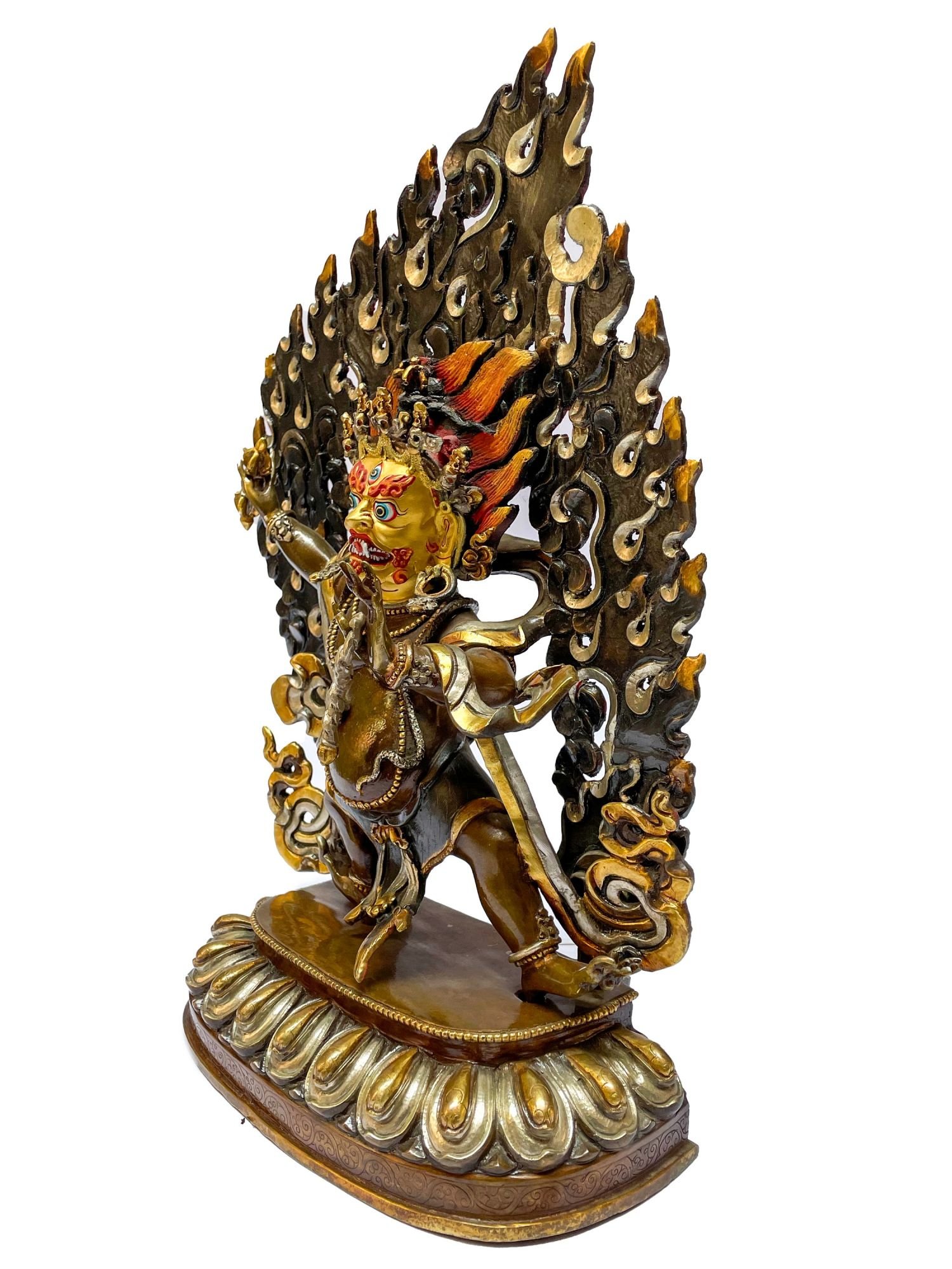 The Vajrapani boasts a mesmerizing double-color oxidation finish, featuring a combination of darker and lighter shades of oxidation. This unique technique adds depth and complexity to the statue's appearance, creating a captivating visual effect. Through a meticulous oxidation process, certain areas of the Vajrapani are intentionally oxidized to achieve a darker shade, while other areas are oxidized to a lighter tone. This deliberate contrast between the two shades creates a dynamic interplay of colors, enhancing the contours and details of the statue. Read More