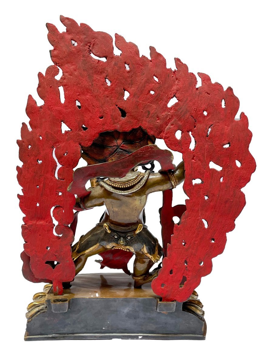 Vajrapani is pictured dancing wildly within a halo of flames, which represent transformation.