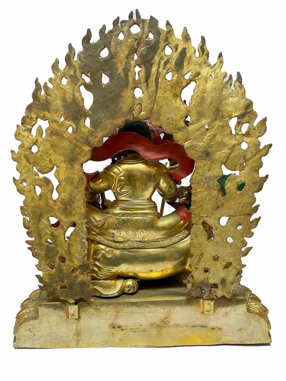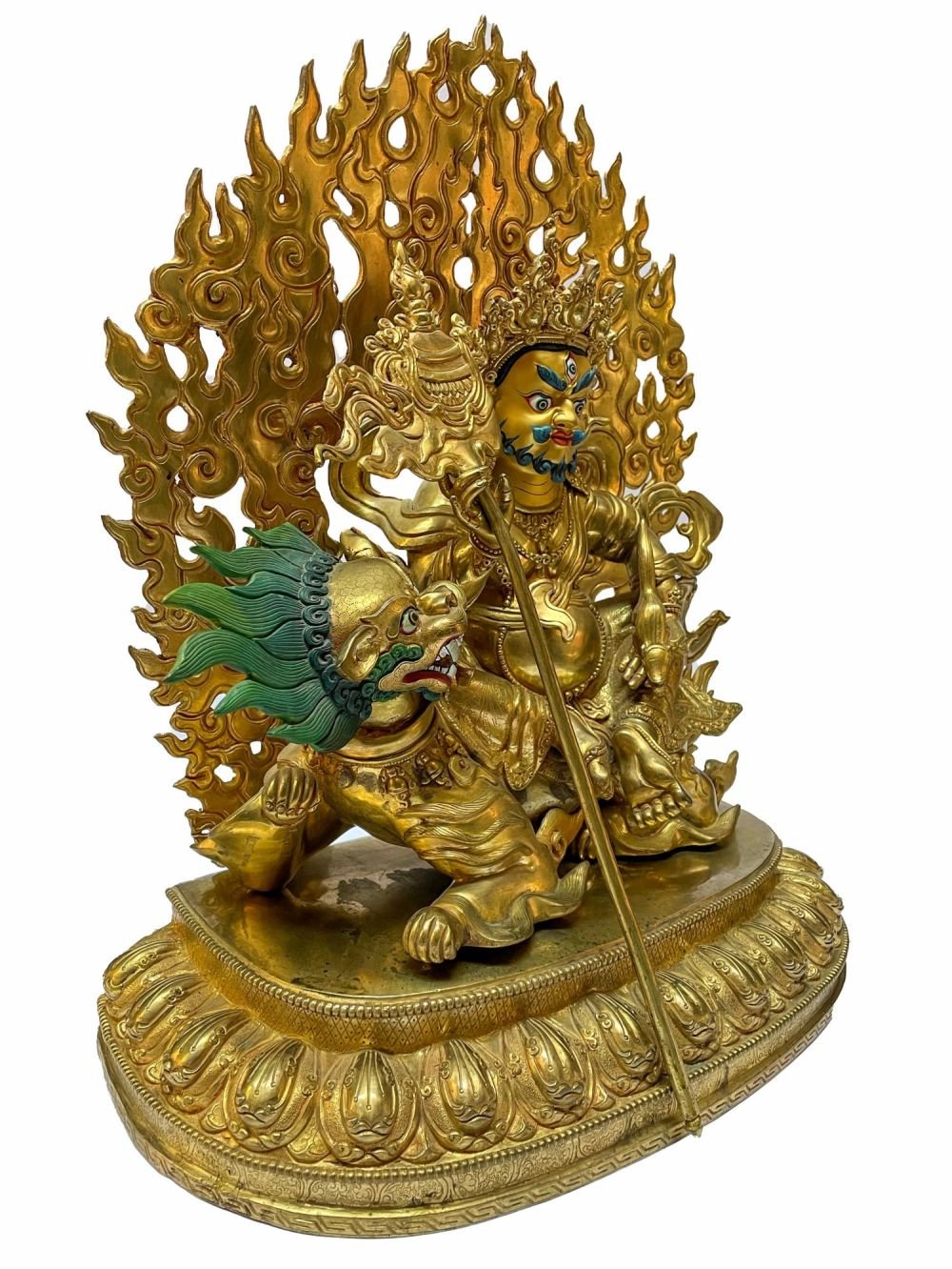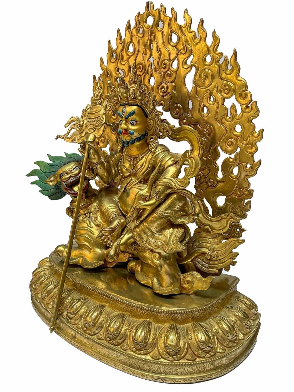 The face of Jambhala: namtose is painted with gold to enhance its significant features, particularly the eyes, and lips. This detailed painting is essential as it brings forth the crucial attributes of the expression of eyes and lips that metal carving alone cannot capture.
