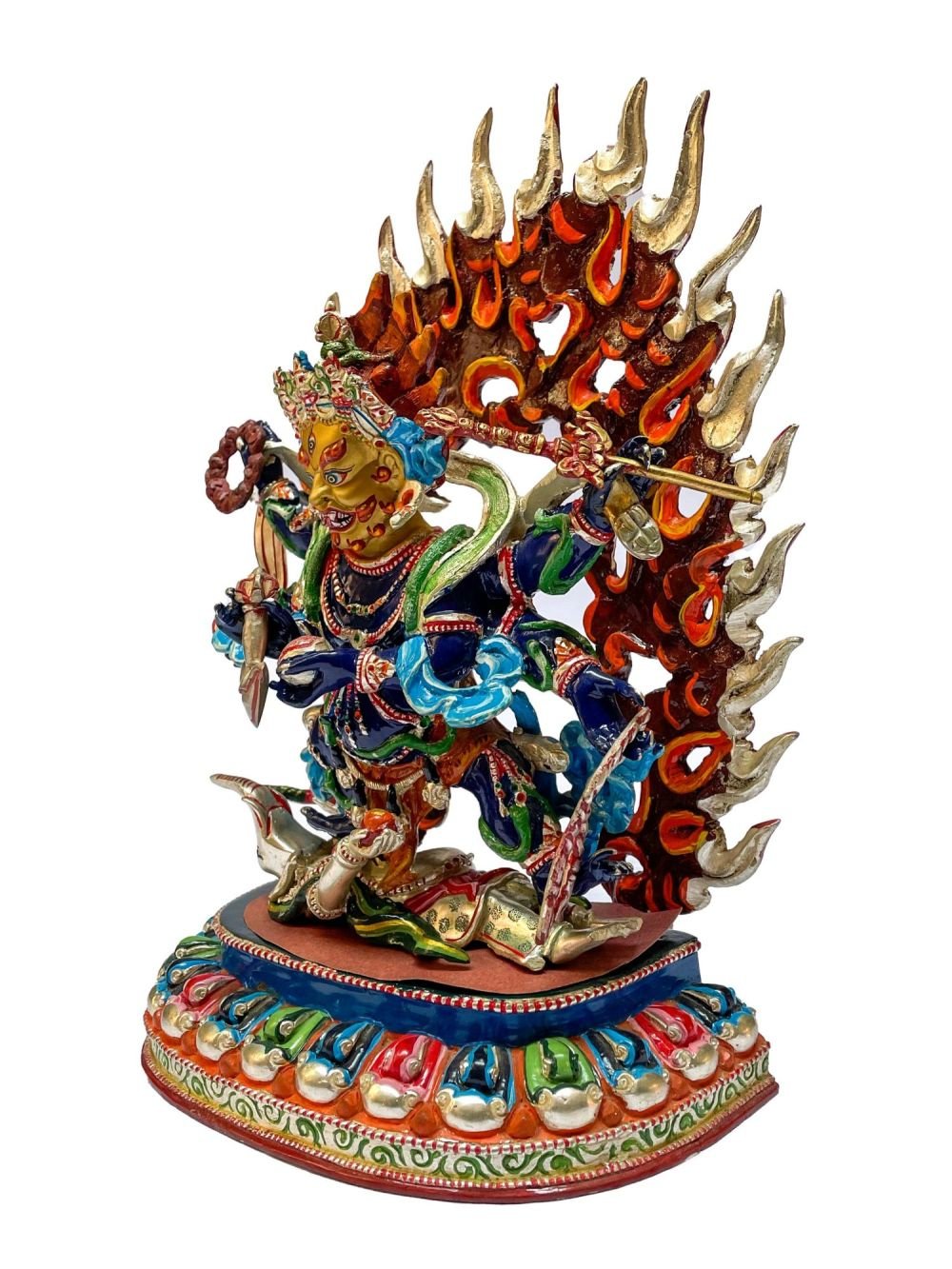 Black Mahakala is typically depicted with a fierce expression, dark blue or black, symbolizing his wrathful nature. He stands on a corpse, representing his triumph over death and impermanence. He has four arms, each holding a symbolic object. His main right hand wields a trident, representing his power over the three poisons of ignorance, attachment, and aversion. In his main left hand, he holds a skull cup filled with blood, symbolizing the transmutation of negative emotions. His remaining two hands hold a curved knife, representing the severance of ignorance, and a lasso, symbolizing the binding of negative forces.