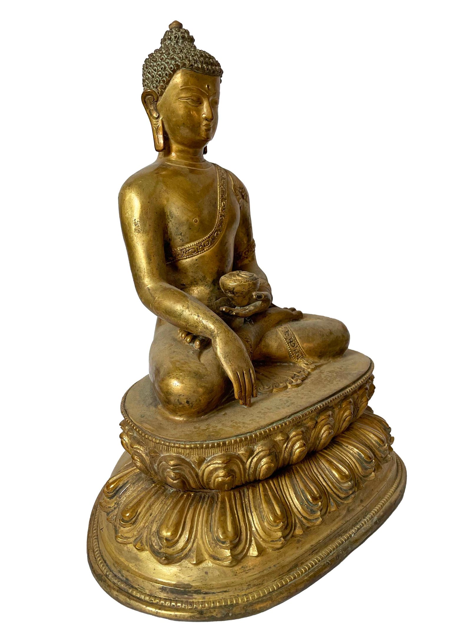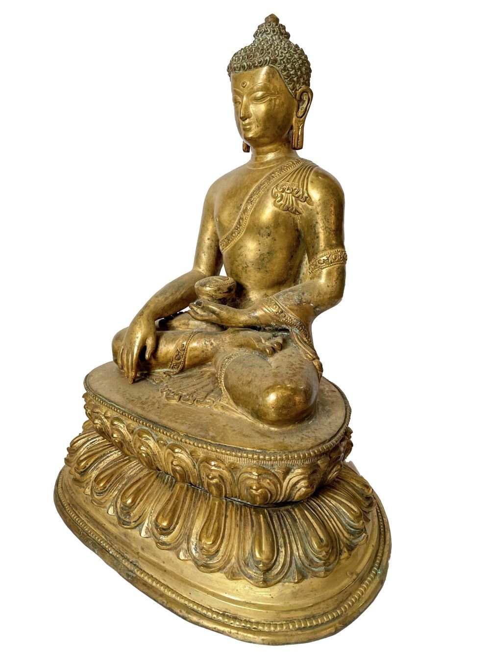 The Shakyamuni Buddha has full gold plated antique finishing. This finishing is a combination of fire mercury gold plating and antique finishing. This traditional technique involves the application of a genuine layer of gold onto the Shakyamuni Buddha using the time-honored process of mercury gold plating. Skilled artisans meticulously handle the amalgamation of gold with mercury, ensuring precise application and a truly authentic result. To enhance its charm further, the Shakyamuni Buddha undergoes an antique finishing process. This meticulous treatment adds a touch of age and character to the gold plating, creating a sense of antiquity. Through careful craftsmanship and the application of specialized techniques, the Shakyamuni Buddha acquires a beautifully aged appearance that adds depth and uniqueness to its overall aesthetic. Read More