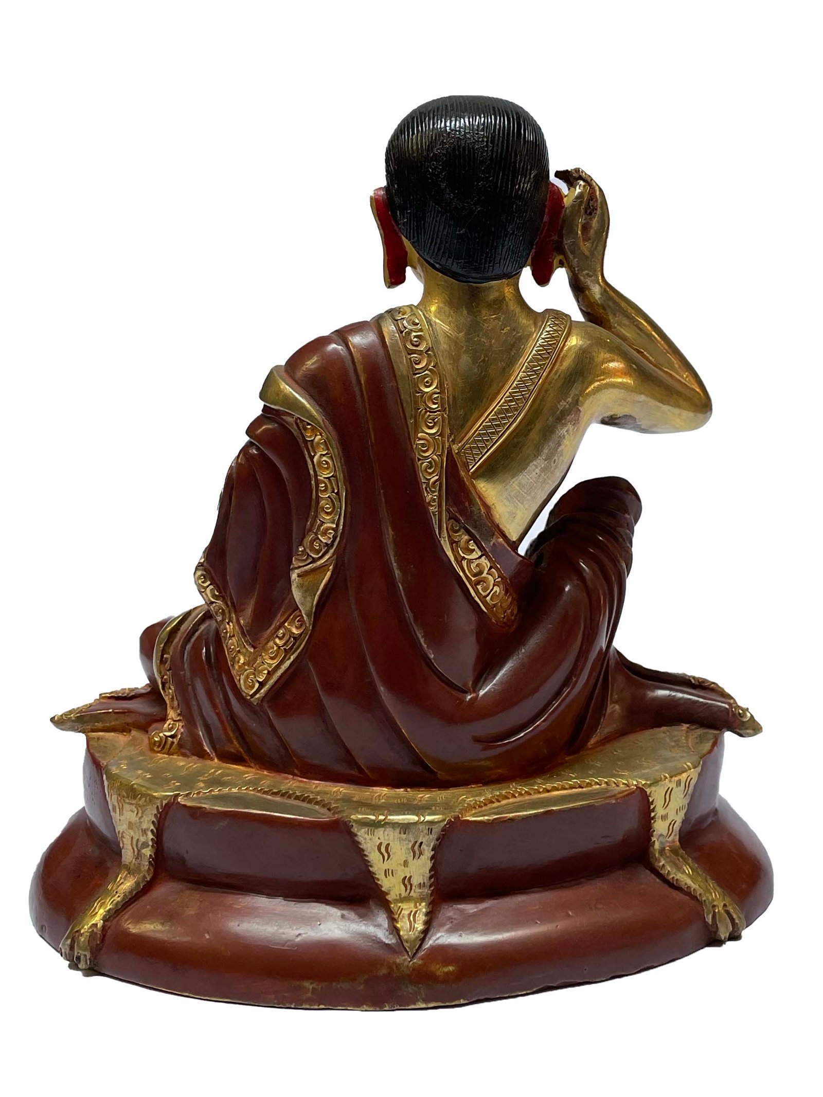 The face of Milarepa is painted with gold to enhance its significant features, particularly the eyes, and lips. This detailed painting is essential as it brings forth the crucial attributes of the expression of eyes and lips that metal carving alone cannot capture.
