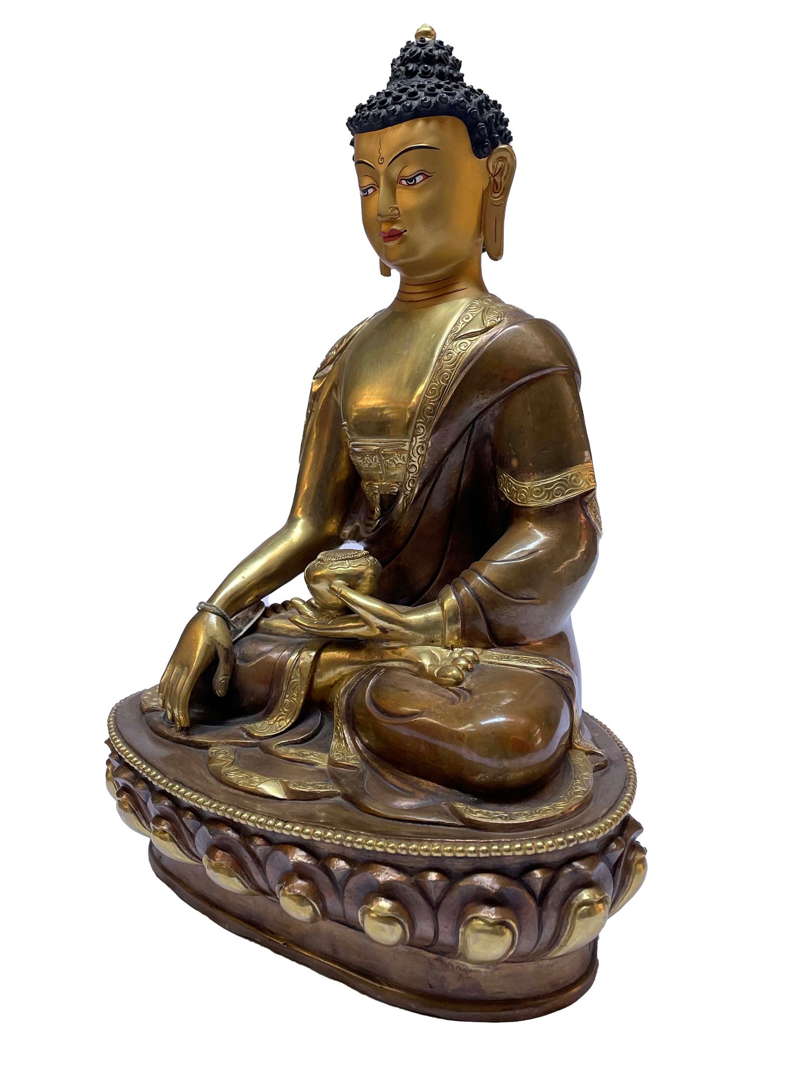This Shakyamuni Buddha has a Partly gold-plated finish. Partly fire gold gilding, a common practice in Nepali handicrafts. This technique is skillfully employed by artisans to create intricate designs on various metal objects, including statues, jewelry, and decorative items. Through a process, a mask or resist is applied to safeguard specific areas from the gold plating. The object is then subjected to high temperatures, allowing the gold to beautifully adhere to exposed surfaces using a combination of heat and pressure.