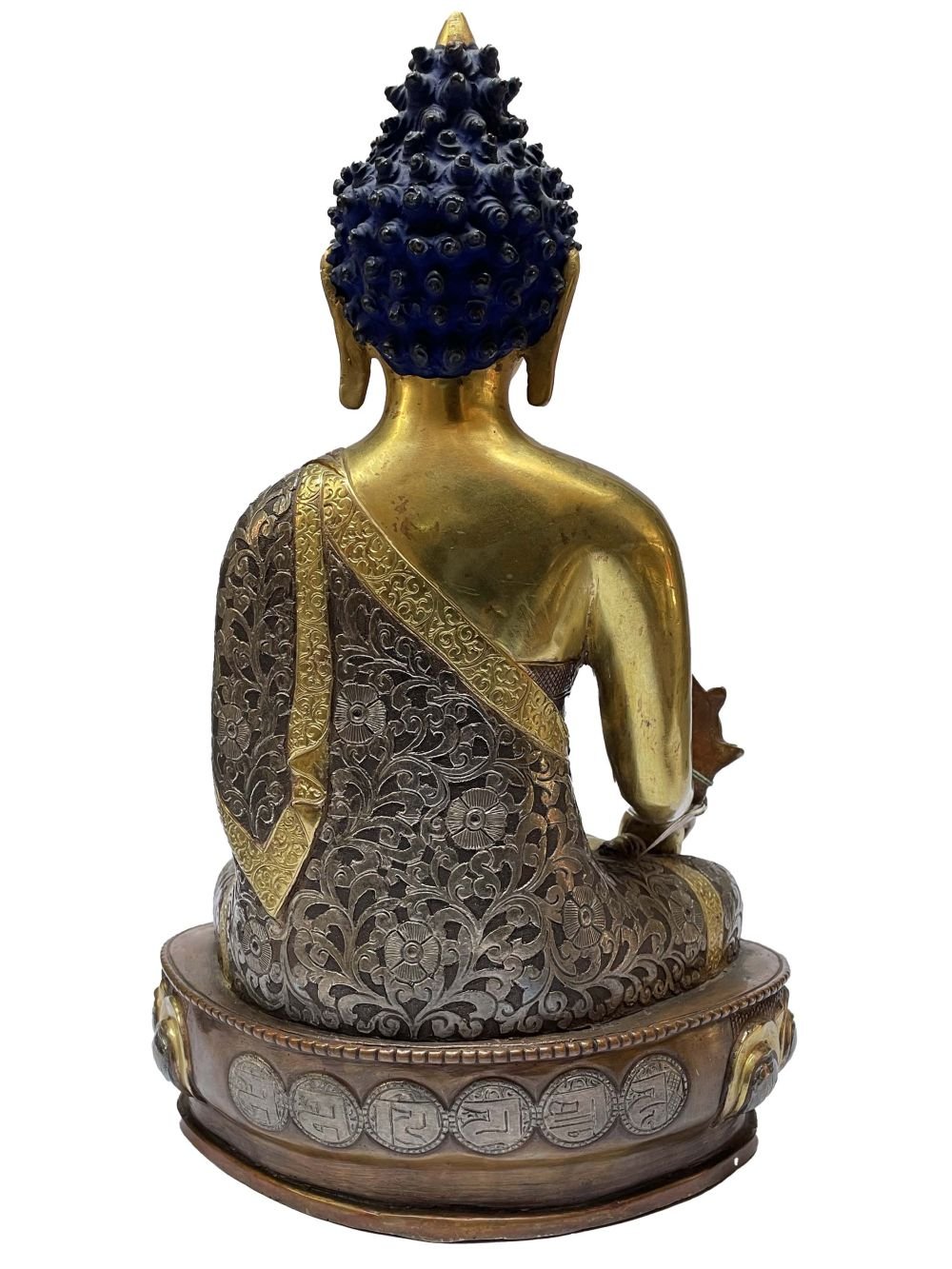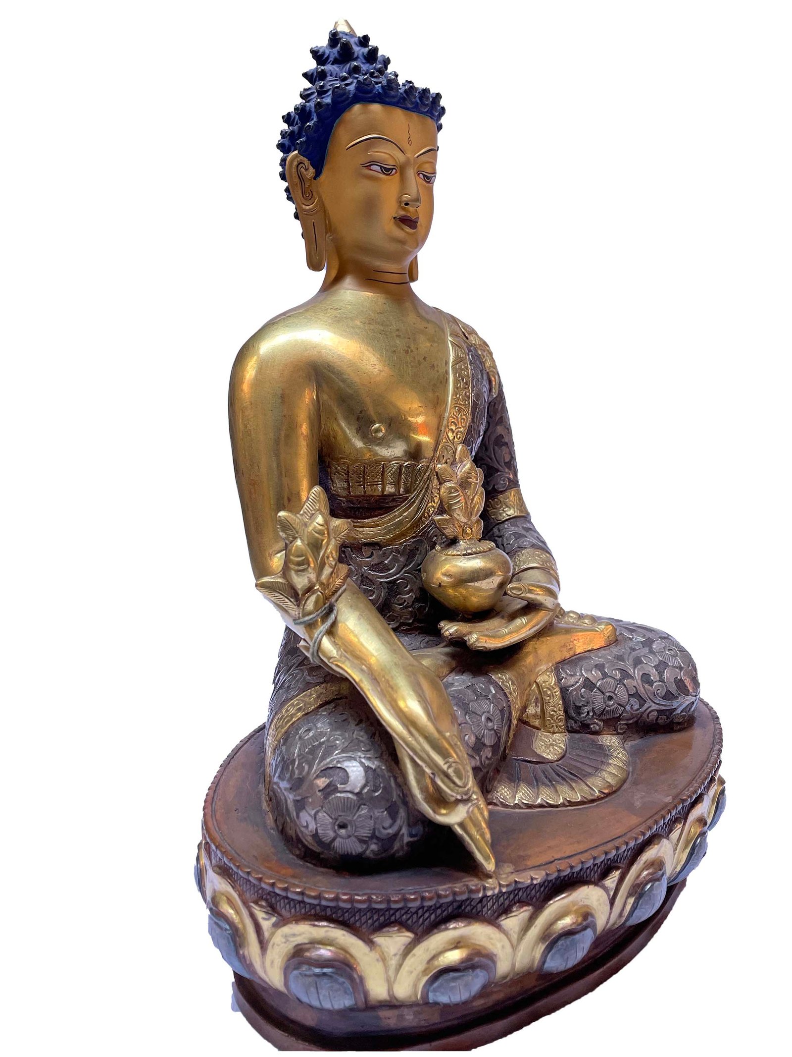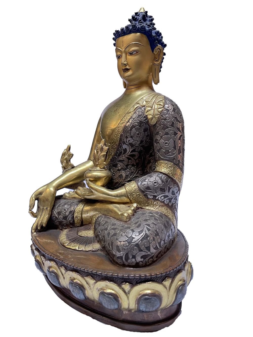 This Buddha has a Partly gold-plated finish. Partly fire gold gilding, a common practice in Nepali handicrafts. This technique is skillfully employed by artisans to create intricate designs on various metal objects, including statues, jewelry, and decorative items. Through a process, a mask or resist is applied to safeguard specific areas from the gold plating. The object is then subjected to high temperatures, allowing the gold to beautifully adhere to exposed surfaces using a combination of heat and pressure.