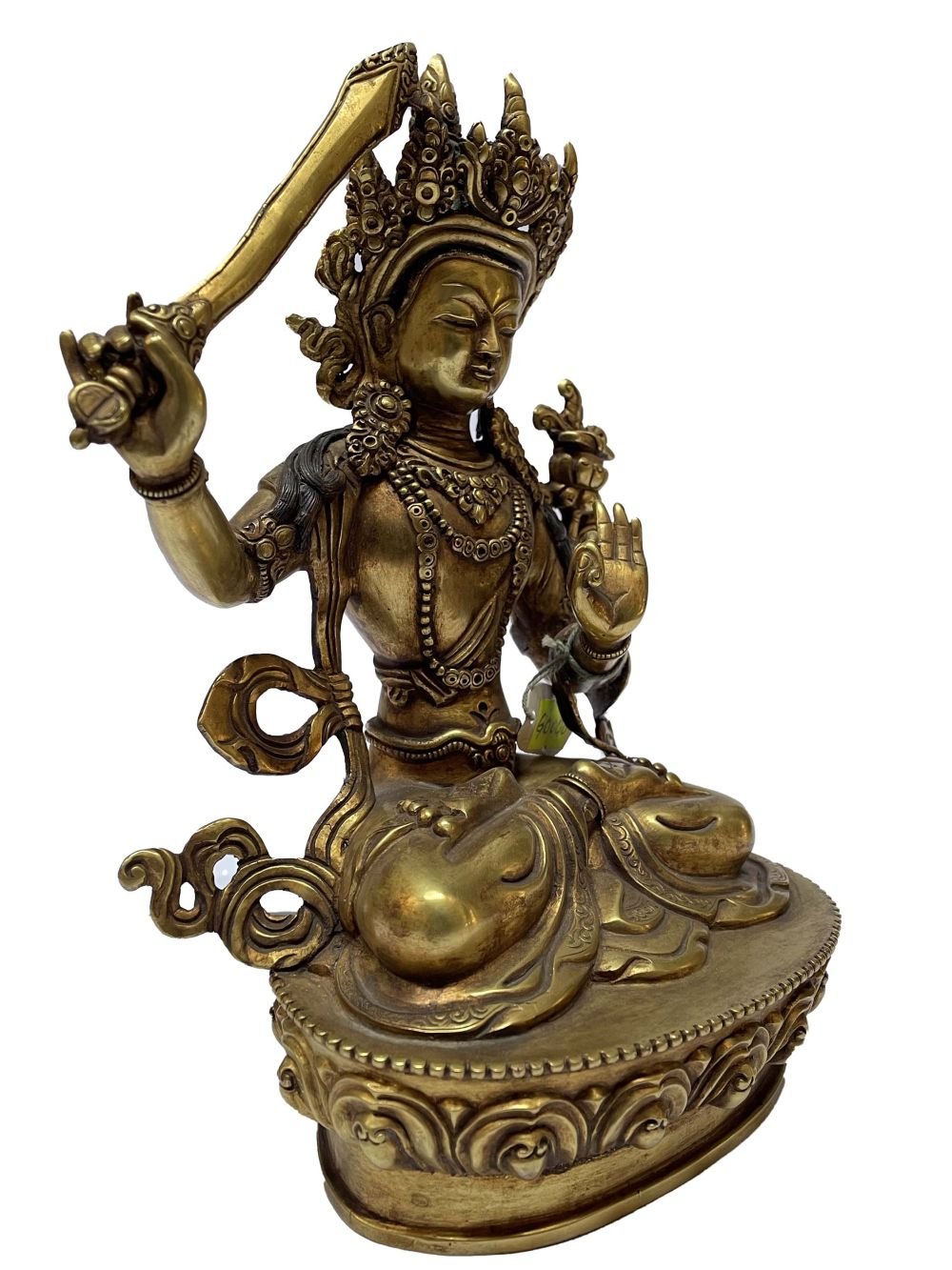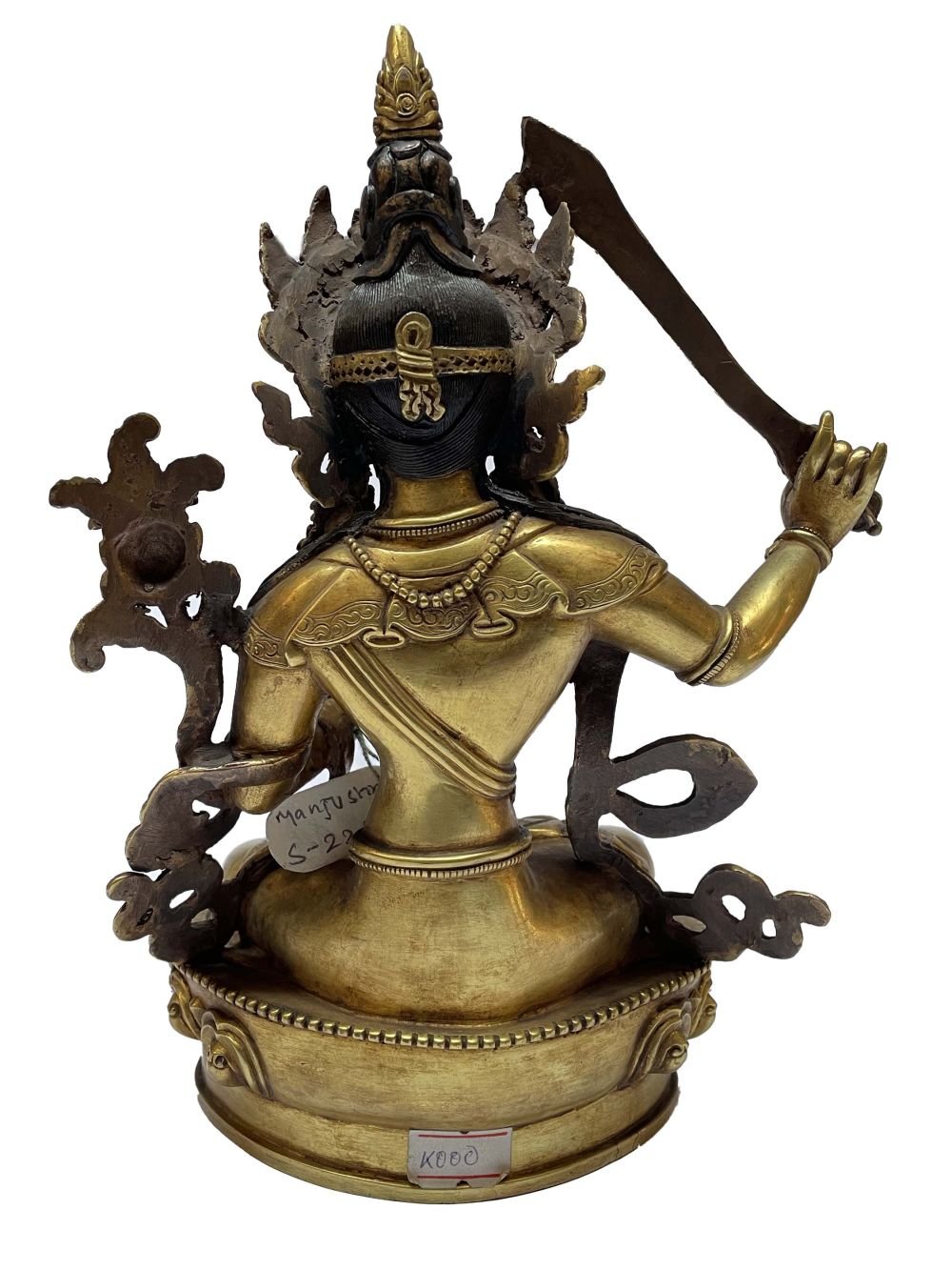 This Manjushri is finished with full gold plating. also known as mercury gold plating or fire gold plating. This traditional technique involves the application of a genuine layer of gold onto the Manjushri. Referred to as mercury gold plating, it is considered the correct and authentic form of gold plating in Nepal. Despite being more expensive than electroplating, this traditional mercury gold plating is gaining popularity again in Nepal. People are drawn to its authenticity, longevity, and the unmatched beauty it brings to the Manjushri. The resurgence of interest in this traditional form of gold plating reflects a growing appreciation for the craftsmanship and cultural heritage of Nepal Read More
