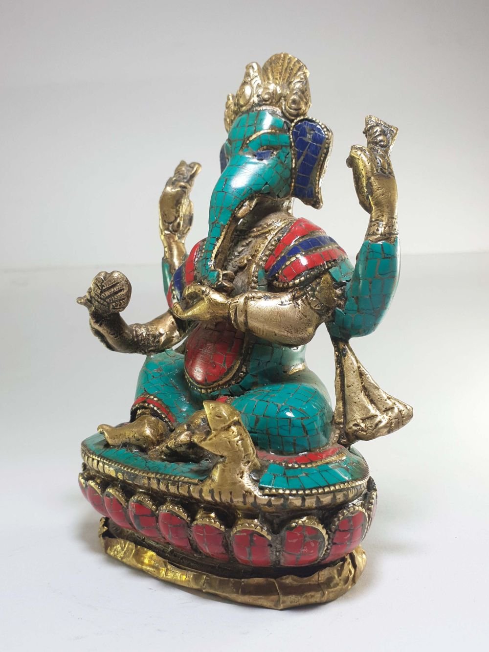 The Ganesh is adorned with an exquisite array of semi-precious stones, including turquoise, coral, and lapis lazuli. These stones are carefully selected and meticulously placed on the Ganesh's surface, adding a touch of opulence and enhancing its overall beauty. Each stone is thoughtfully positioned using a high-quality adhesive, ensuring secure and long-lasting attachment. The vibrant colors and unique patterns of the stones create a captivating contrast against the backdrop of the Ganesh, elevating its visual appeal and making it truly eye-catching. Read More