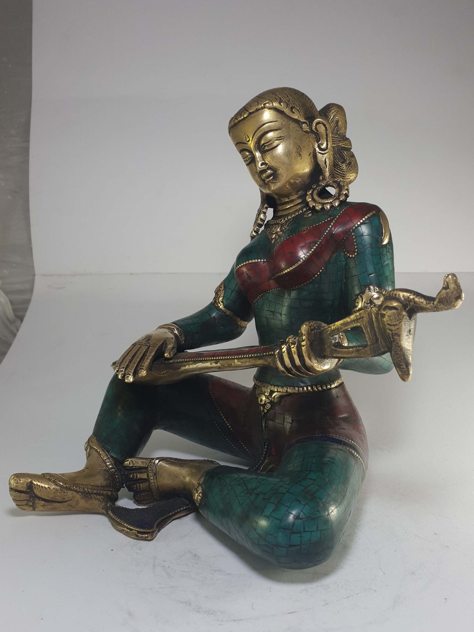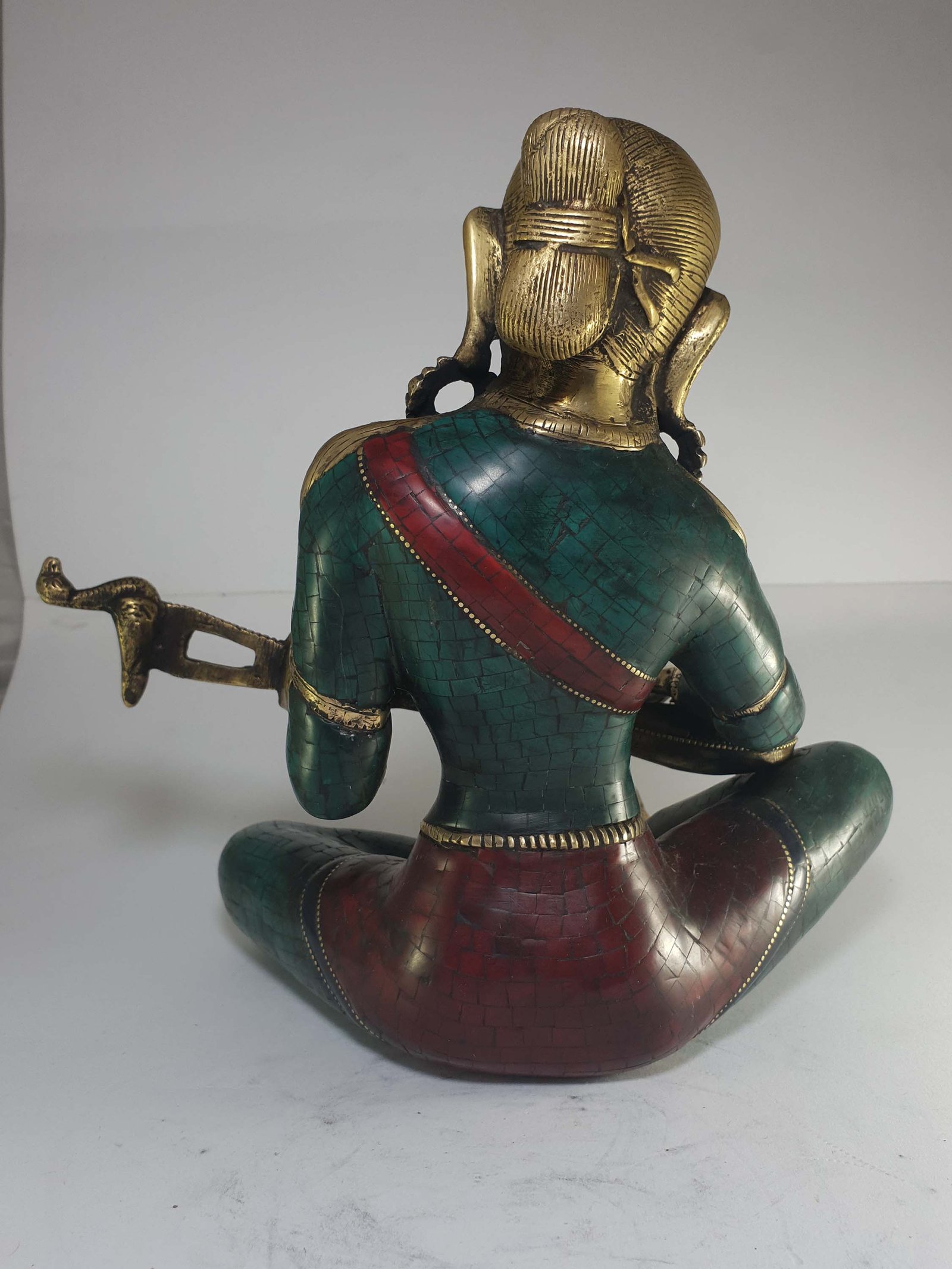 The Saraswati is adorned with an exquisite array of semi-precious stones, including turquoise, coral, and lapis lazuli. These stones are carefully selected and meticulously placed on the Saraswati's surface, adding a touch of opulence and enhancing its overall beauty. Each stone is thoughtfully positioned using a high-quality adhesive, ensuring secure and long-lasting attachment. The vibrant colors and unique patterns of the stones create a captivating contrast against the backdrop of the Saraswati, elevating its visual appeal and making it truly eye-catching. Read More