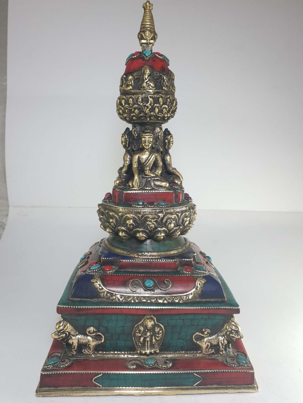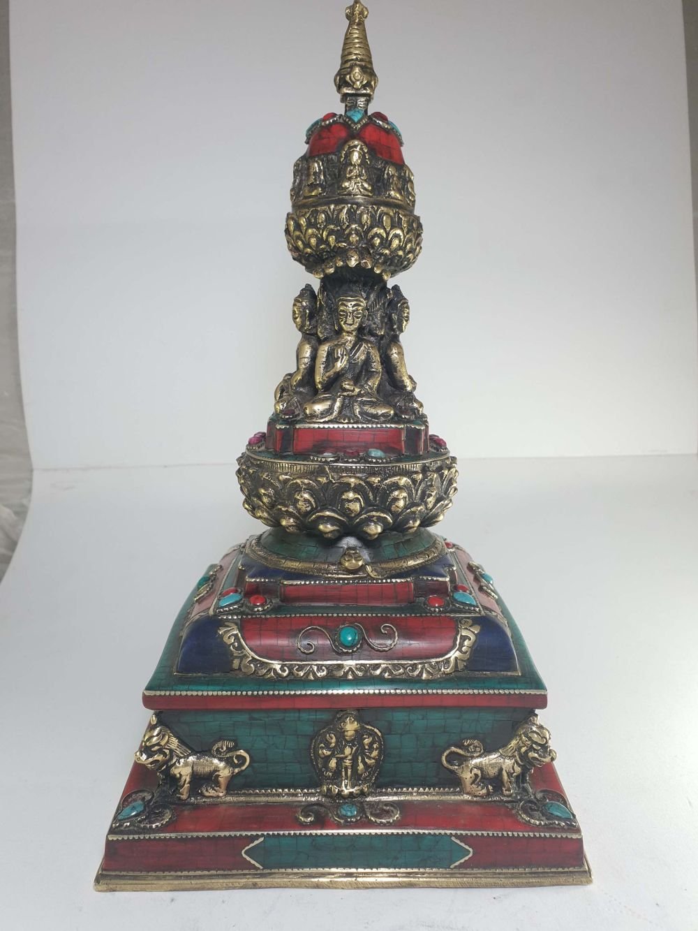 The Stupa is adorned with an exquisite array of semi-precious stones, including turquoise, coral, and lapis lazuli. These stones are carefully selected and meticulously placed on the Stupa's surface, adding a touch of opulence and enhancing its overall beauty. Each stone is thoughtfully positioned using a high-quality adhesive, ensuring secure and long-lasting attachment. The vibrant colors and unique patterns of the stones create a captivating contrast against the backdrop of the Stupa, elevating its visual appeal and making it truly eye-catching. Read More