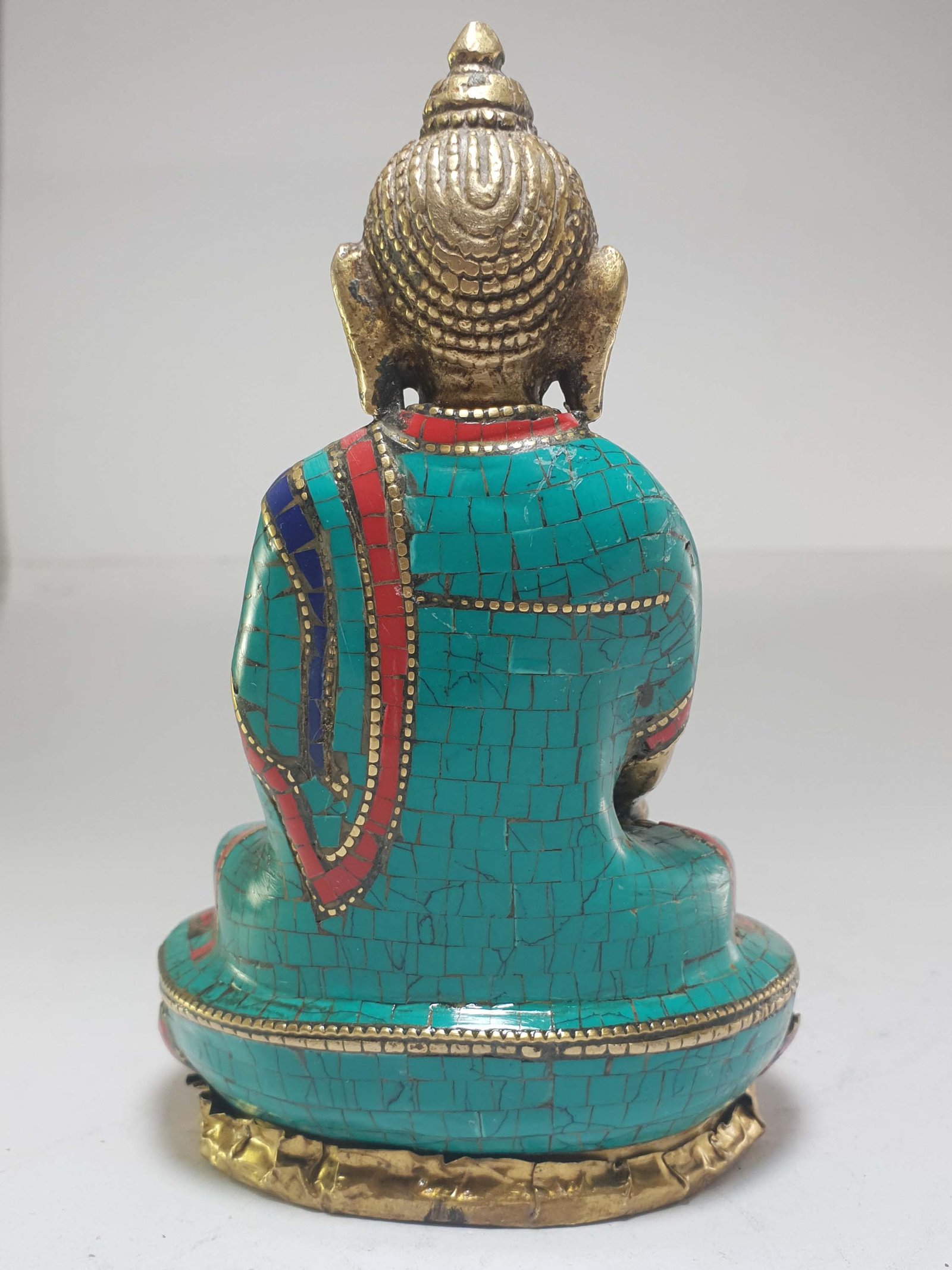 The Ratnasambhava Buddha is adorned with an exquisite array of semi-precious stones, including turquoise, coral, and lapis lazuli. These stones are carefully selected and meticulously placed on the Ratnasambhava Buddha's surface, adding a touch of opulence and enhancing its overall beauty. Each stone is thoughtfully positioned using a high-quality adhesive, ensuring secure and long-lasting attachment. The vibrant colors and unique patterns of the stones create a captivating contrast against the backdrop of the Ratnasambhava Buddha, elevating its visual appeal and making it truly eye-catching. Read More