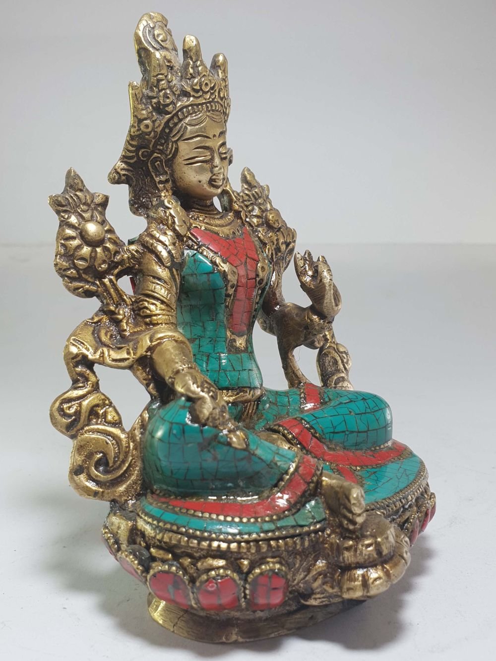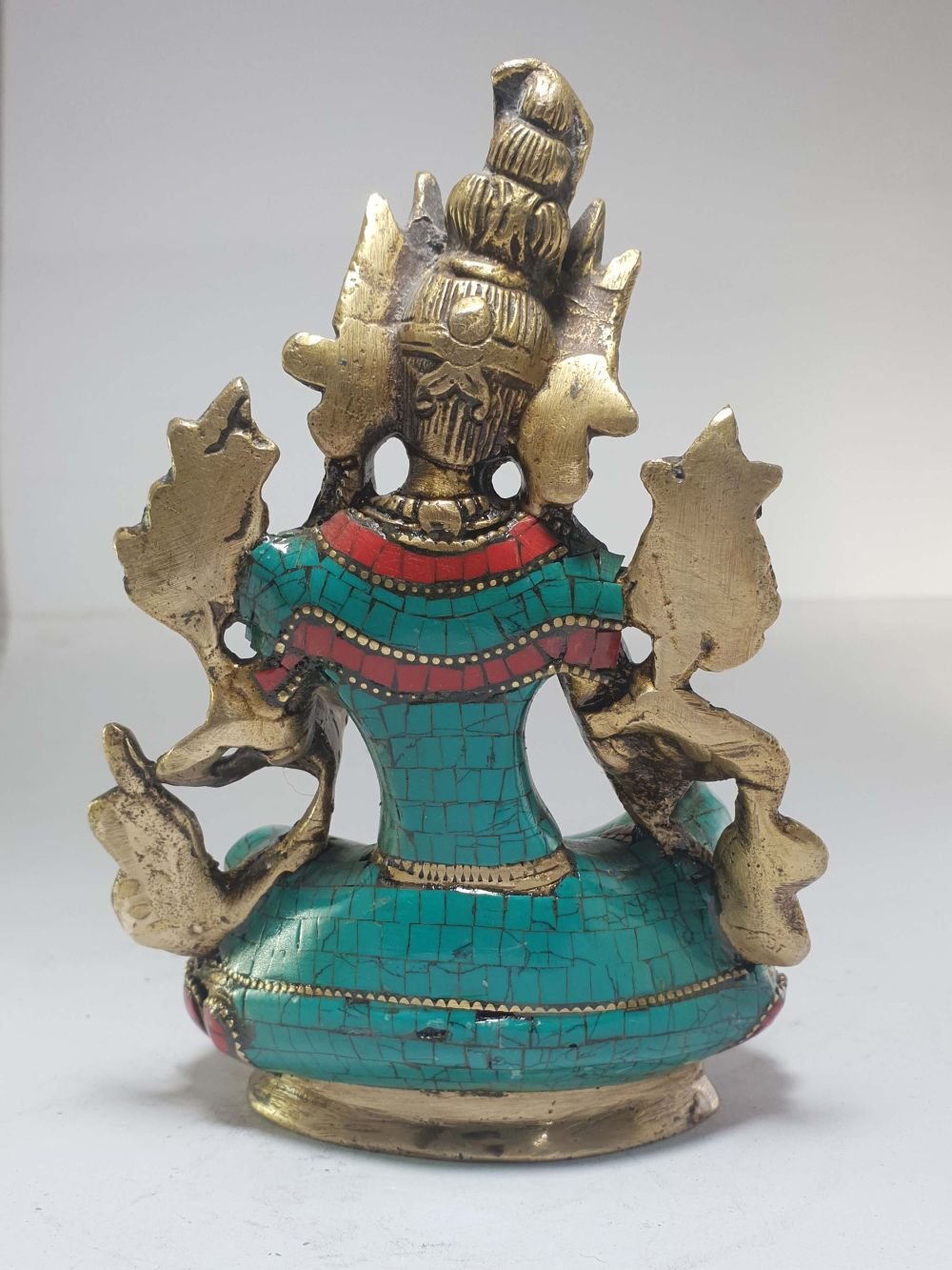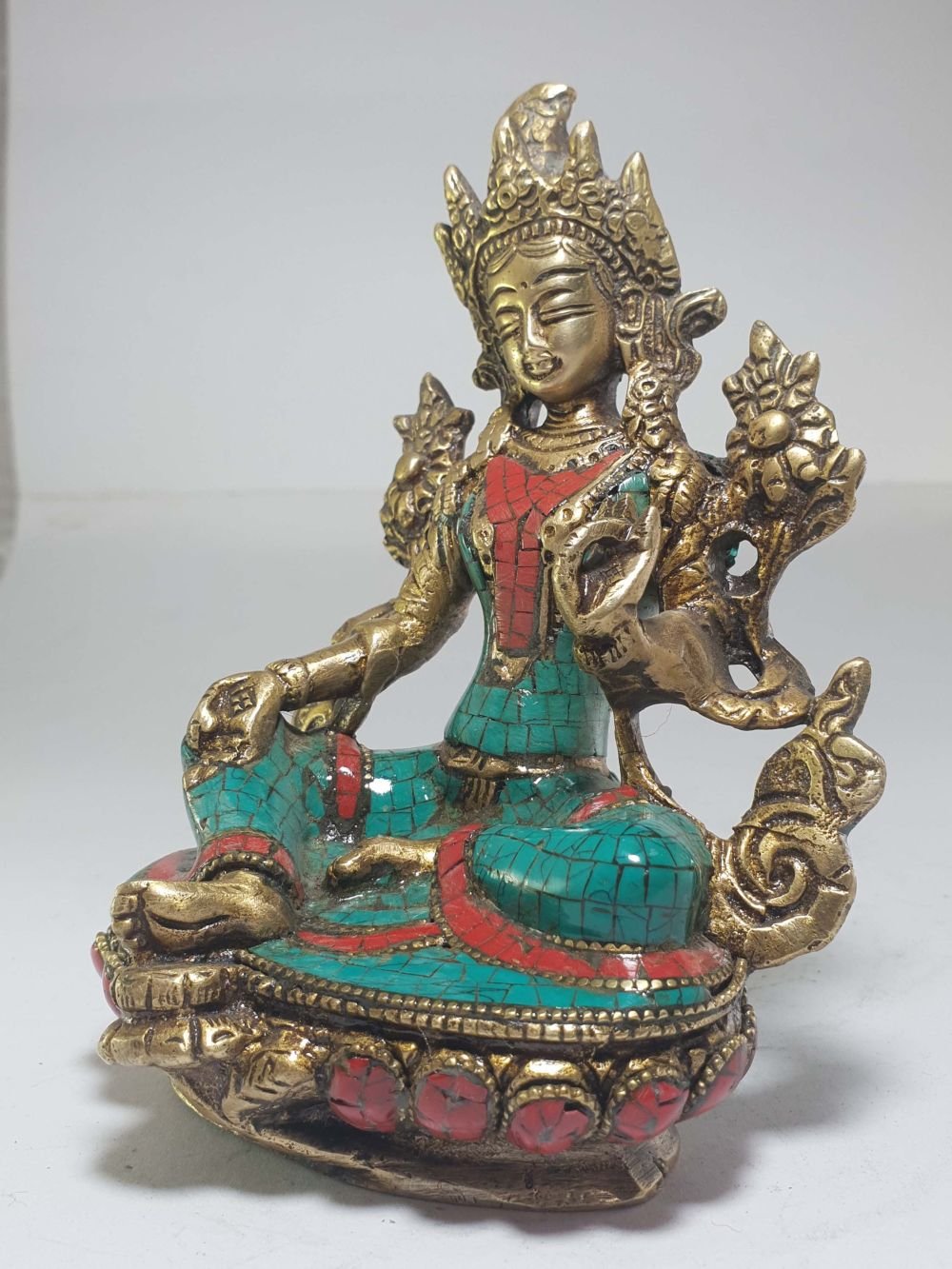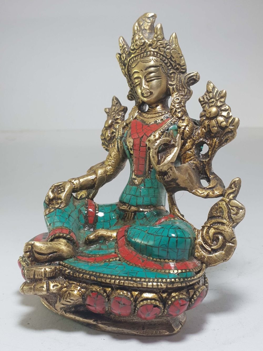 The Green Tara is adorned with an exquisite array of semi-precious stones, including turquoise, coral, and lapis lazuli. These stones are carefully selected and meticulously placed on the Green Tara's surface, adding a touch of opulence and enhancing its overall beauty. Each stone is thoughtfully positioned using a high-quality adhesive, ensuring secure and long-lasting attachment. The vibrant colors and unique patterns of the stones create a captivating contrast against the backdrop of the Green Tara, elevating its visual appeal and making it truly eye-catching. Read More
