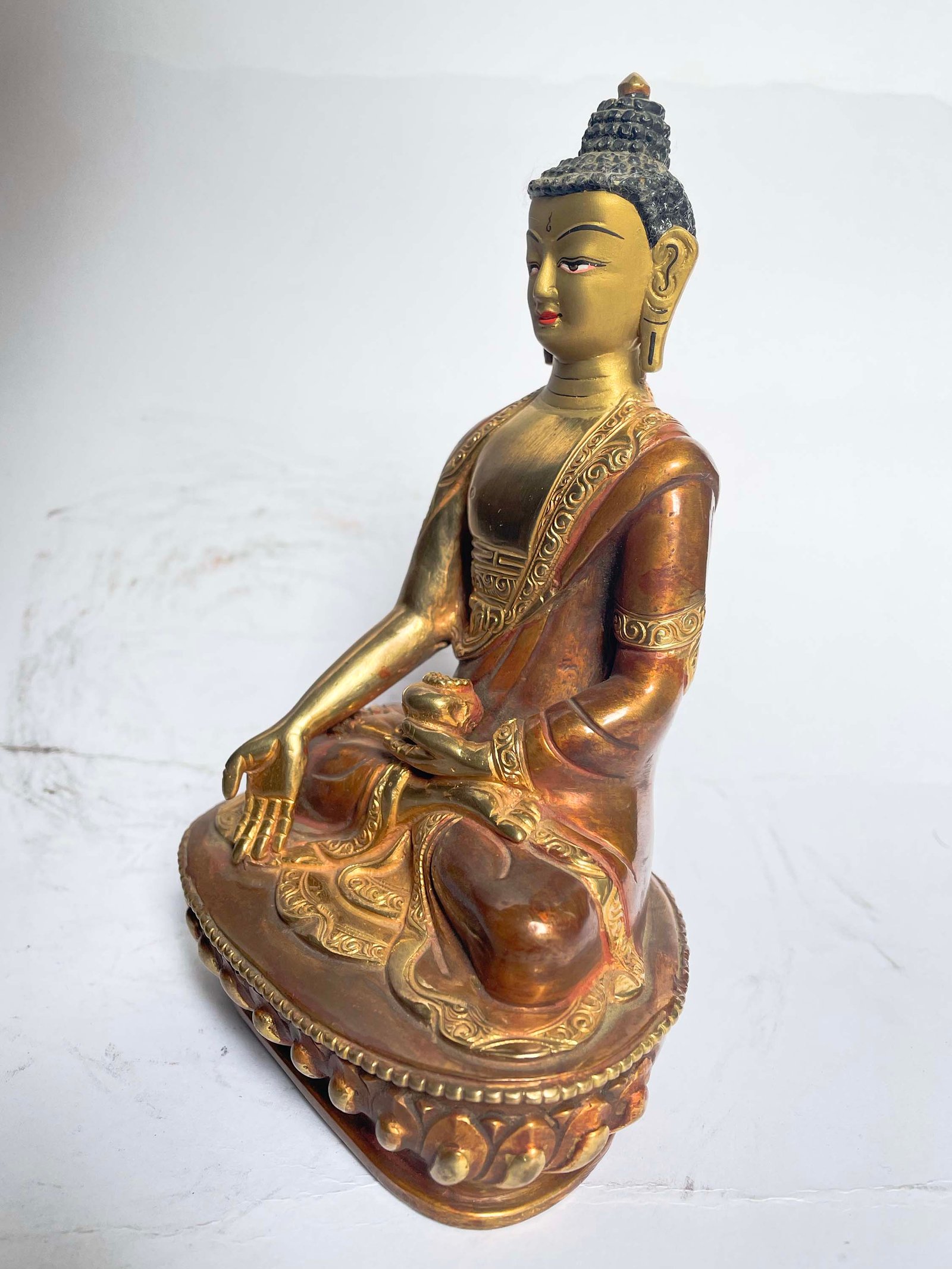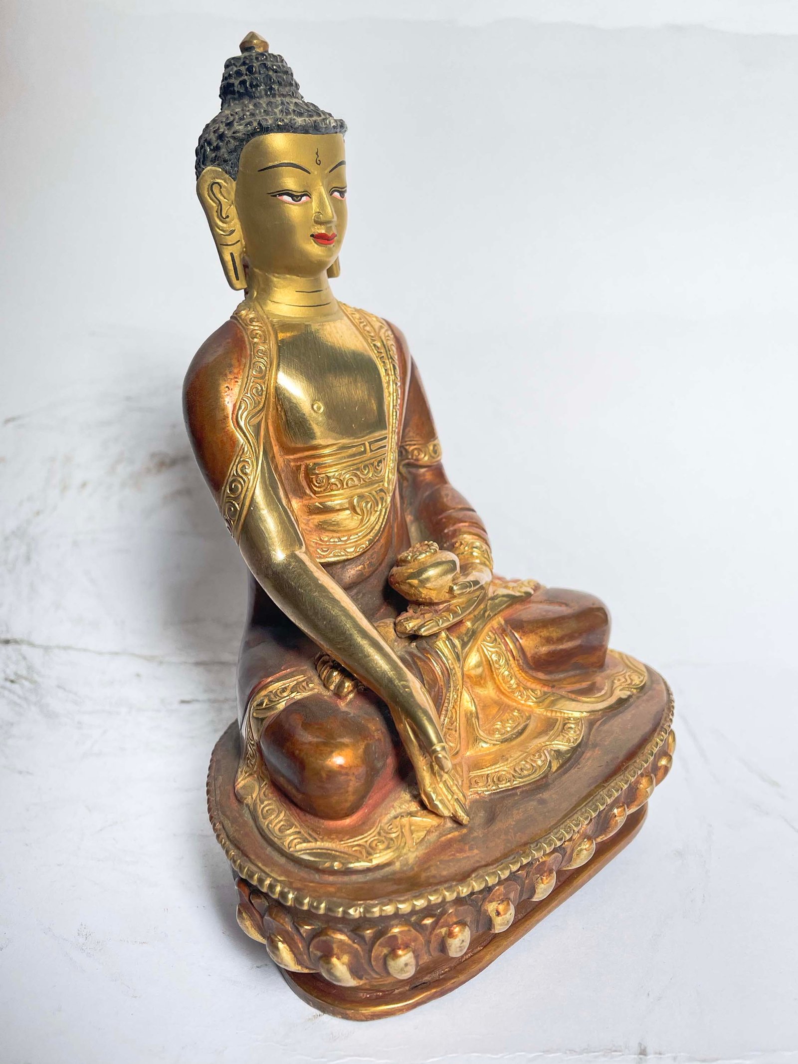 This Buddha is finished with full gold plating. also known as mercury gold plating or fire gold plating. This traditional technique involves the application of a genuine layer of gold onto the Buddha. Referred to as mercury gold plating, it is considered the correct and authentic form of gold plating in Nepal. Despite being more expensive than electroplating, this traditional mercury gold plating is gaining popularity again in Nepal. People are drawn to its authenticity, longevity, and the unmatched beauty it brings to the Buddha. The resurgence of interest in this traditional form of gold plating reflects a growing appreciation for the craftsmanship and cultural heritage of Nepal Read More