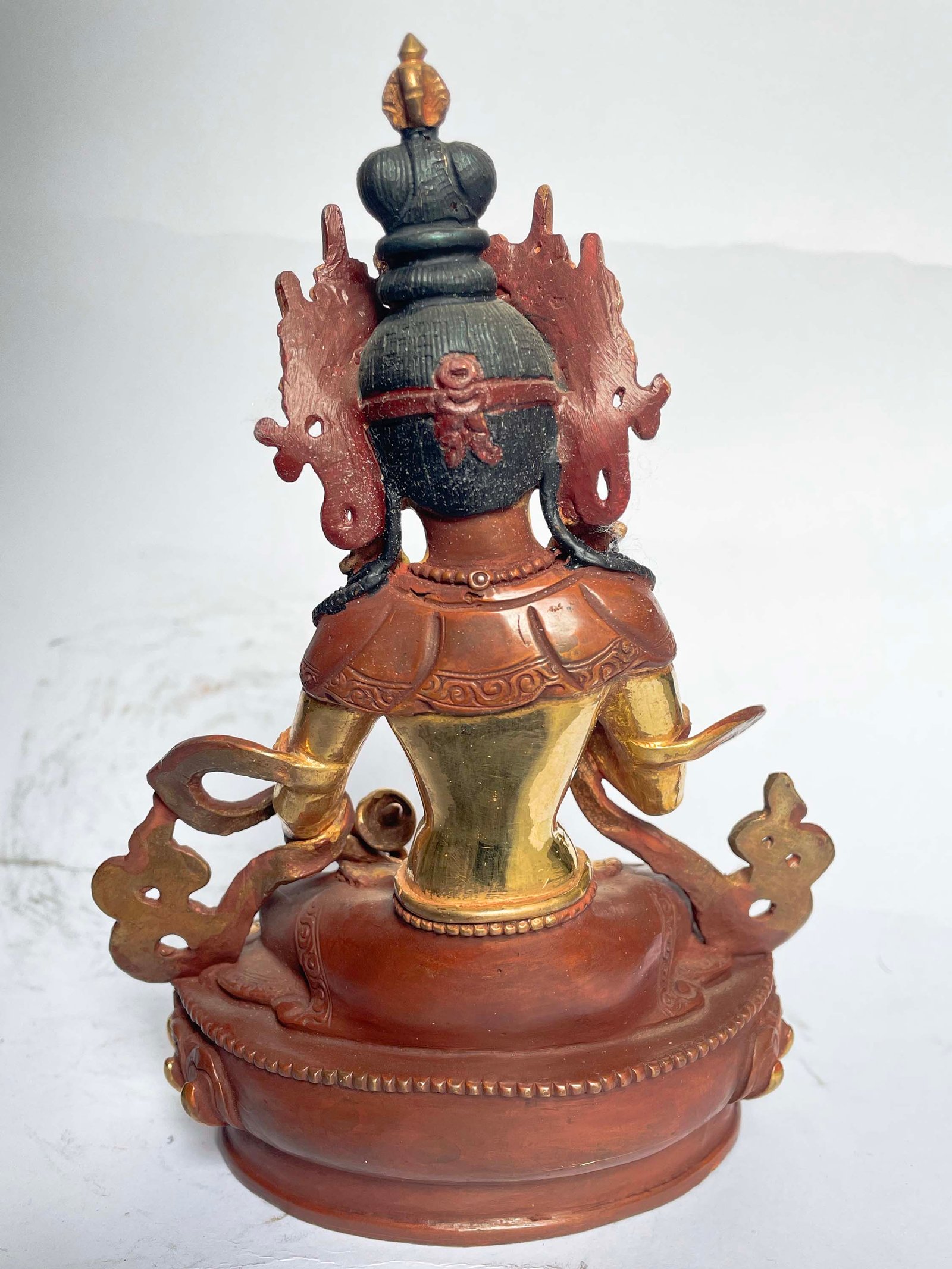 This Vajrasattva is finished with full gold plating. also known as mercury gold plating or fire gold plating. This traditional technique involves the application of a genuine layer of gold onto the Vajrasattva. Referred to as mercury gold plating, it is considered the correct and authentic form of gold plating in Nepal. Despite being more expensive than electroplating, this traditional mercury gold plating is gaining popularity again in Nepal. People are drawn to its authenticity, longevity, and the unmatched beauty it brings to the Vajrasattva. The resurgence of interest in this traditional form of gold plating reflects a growing appreciation for the craftsmanship and cultural heritage of Nepal Read More