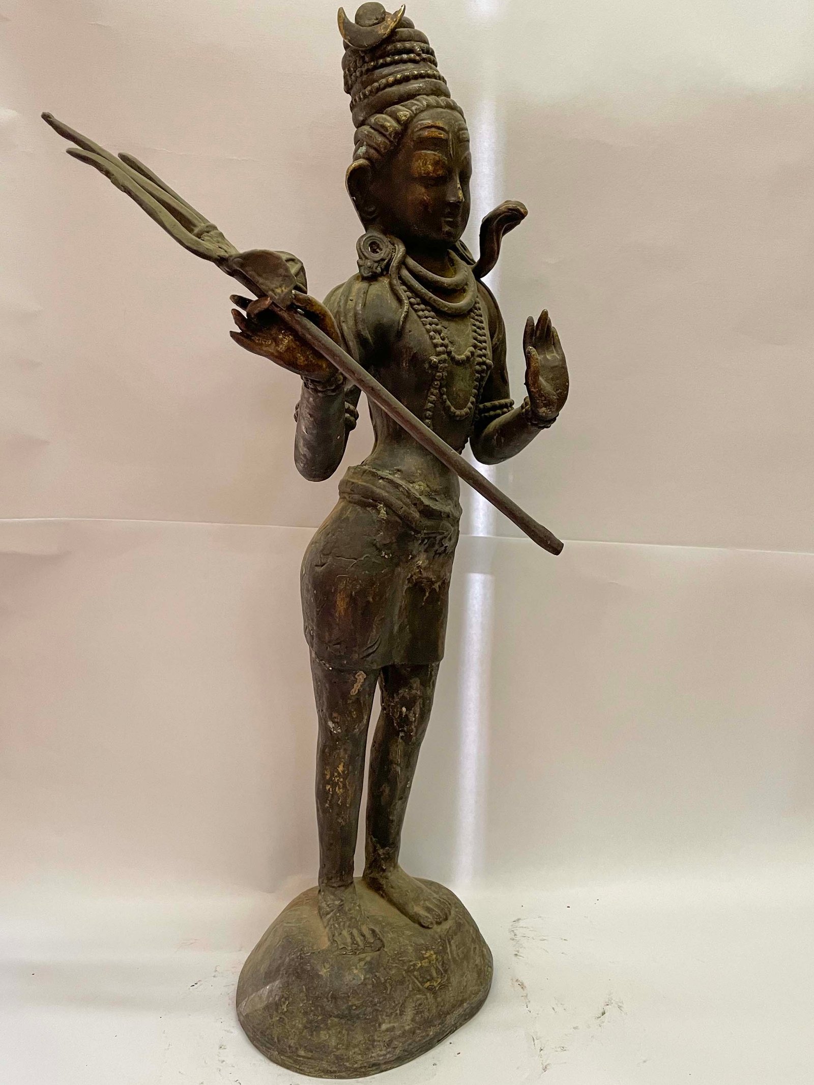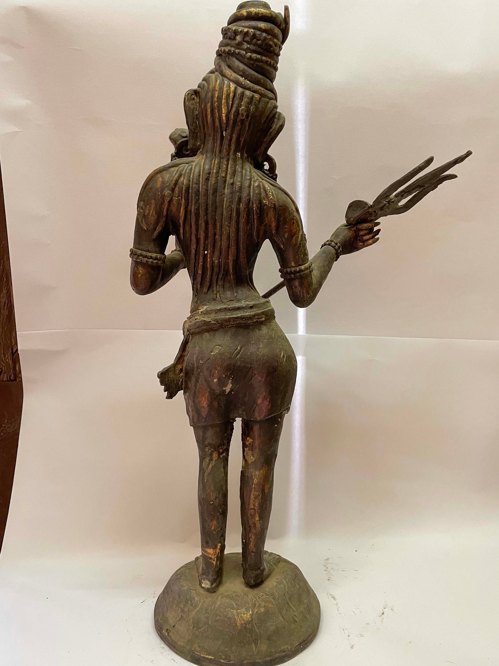 This Shiva has been meticulously treated with a chocolate color antique patina. The intention behind this patina is to replicate the appearance of a copper statue that has gracefully aged over a century. Unlike a simple coat of paint, this patina is not applied superficially and is designed to endure. It undergoes an artificial oxidation process that adds depth and character, while also serving as a protective layer against natural oxidation.