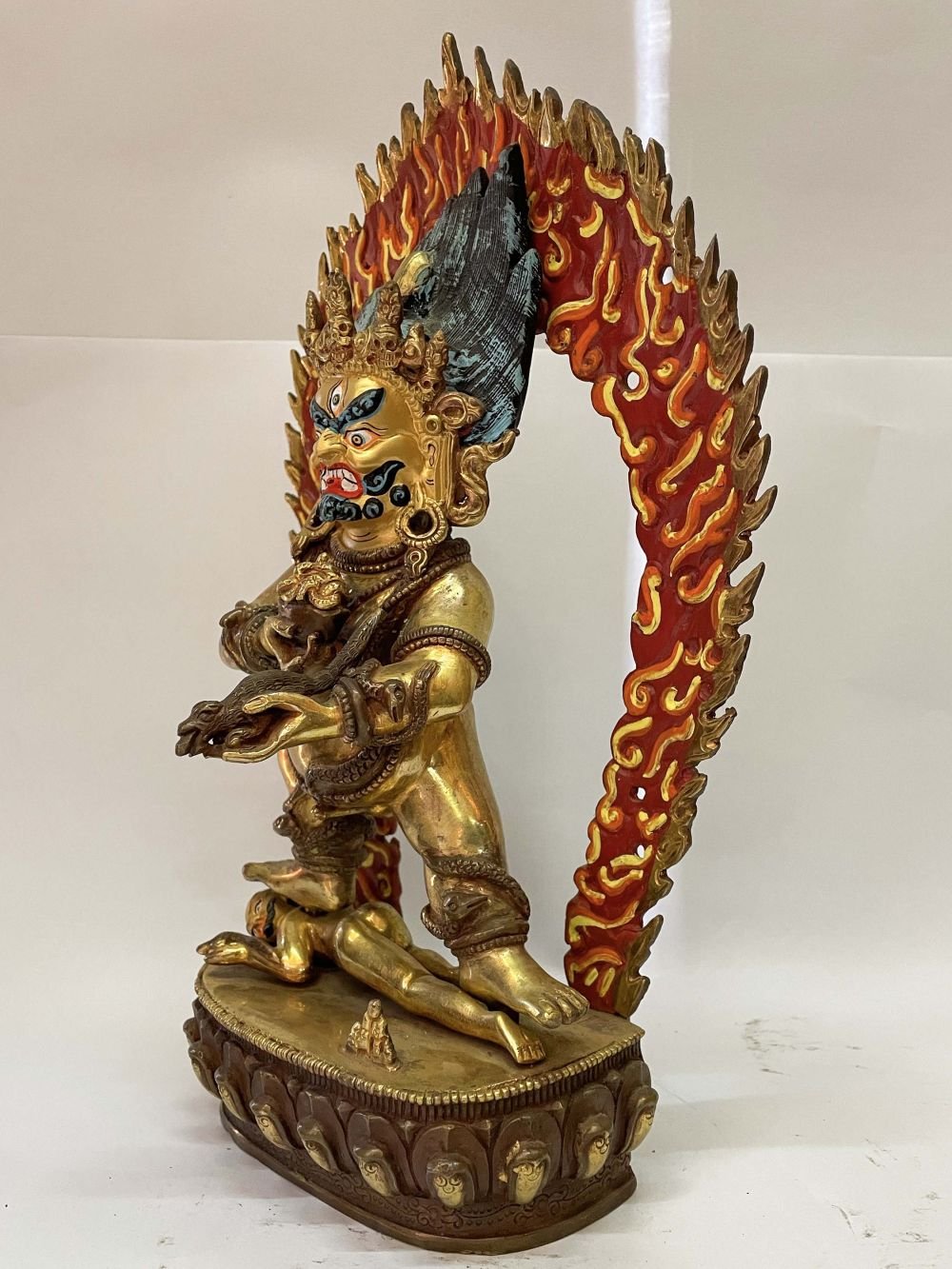Popularized by Shakyasribhadra, holding a skullcup and mongoose, naked and wrathful in a standing posture. He is the God of Wealth in Tibetan buddhism. With august guise he treads on the back of yellow rich man. Jambhala, Black (Tibetan: dzam bha la, nag po), a wealth deity popularized in Tibet by Bari Lotsawa (b.1040) and the Kashmiri teacher Shakyashri Bhadra.