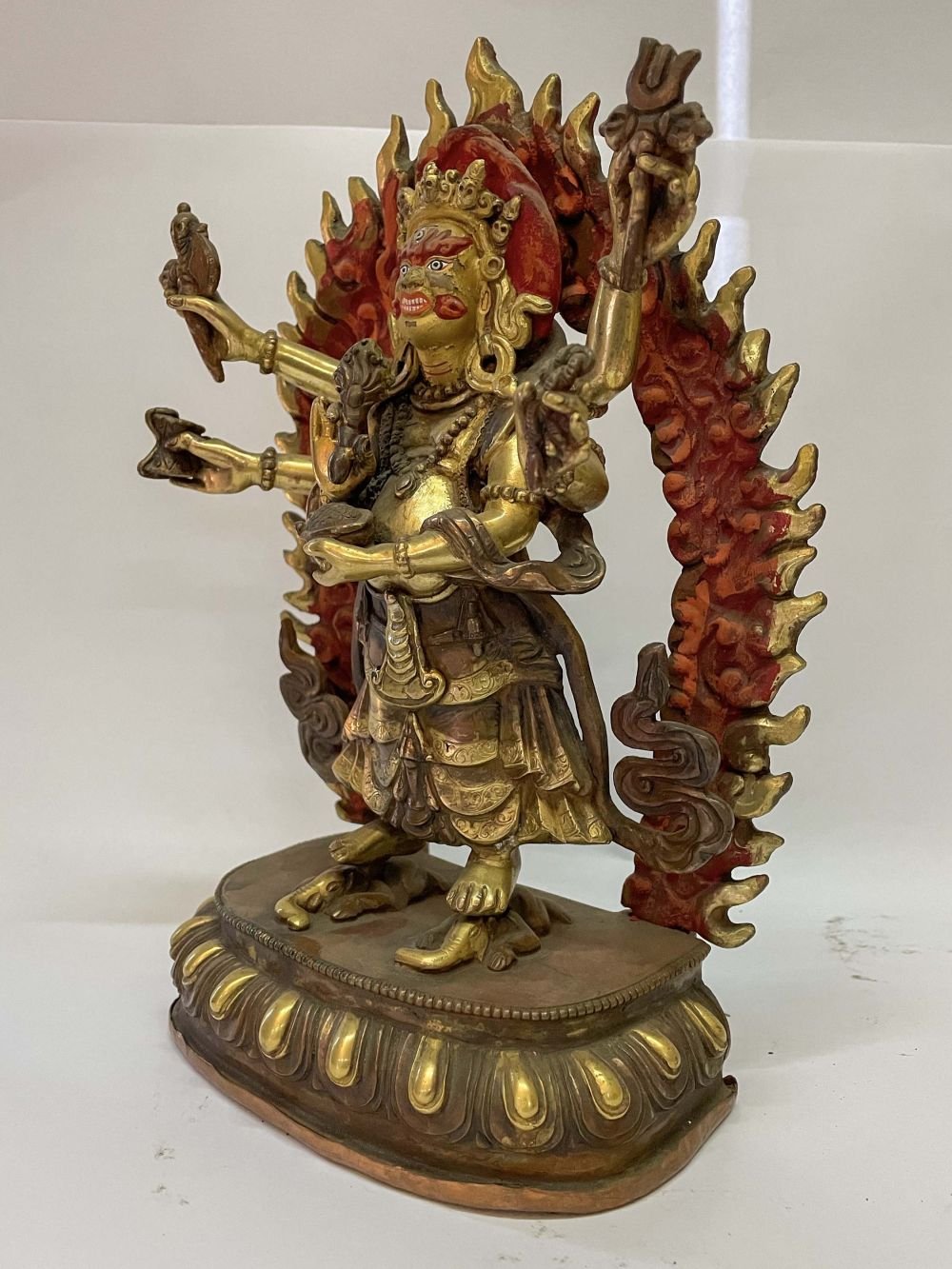This White Mahakala has a Partly gold-plated finish. Partly fire gold gilding, a common practice in Nepali handicrafts. This technique is skillfully employed by artisans to create intricate designs on various metal objects, including statues, jewelry, and decorative items. Through a process, a mask or resist is applied to safeguard specific areas from the gold plating. The object is then subjected to high temperatures, allowing the gold to beautifully adhere to exposed surfaces using a combination of heat and pressure.