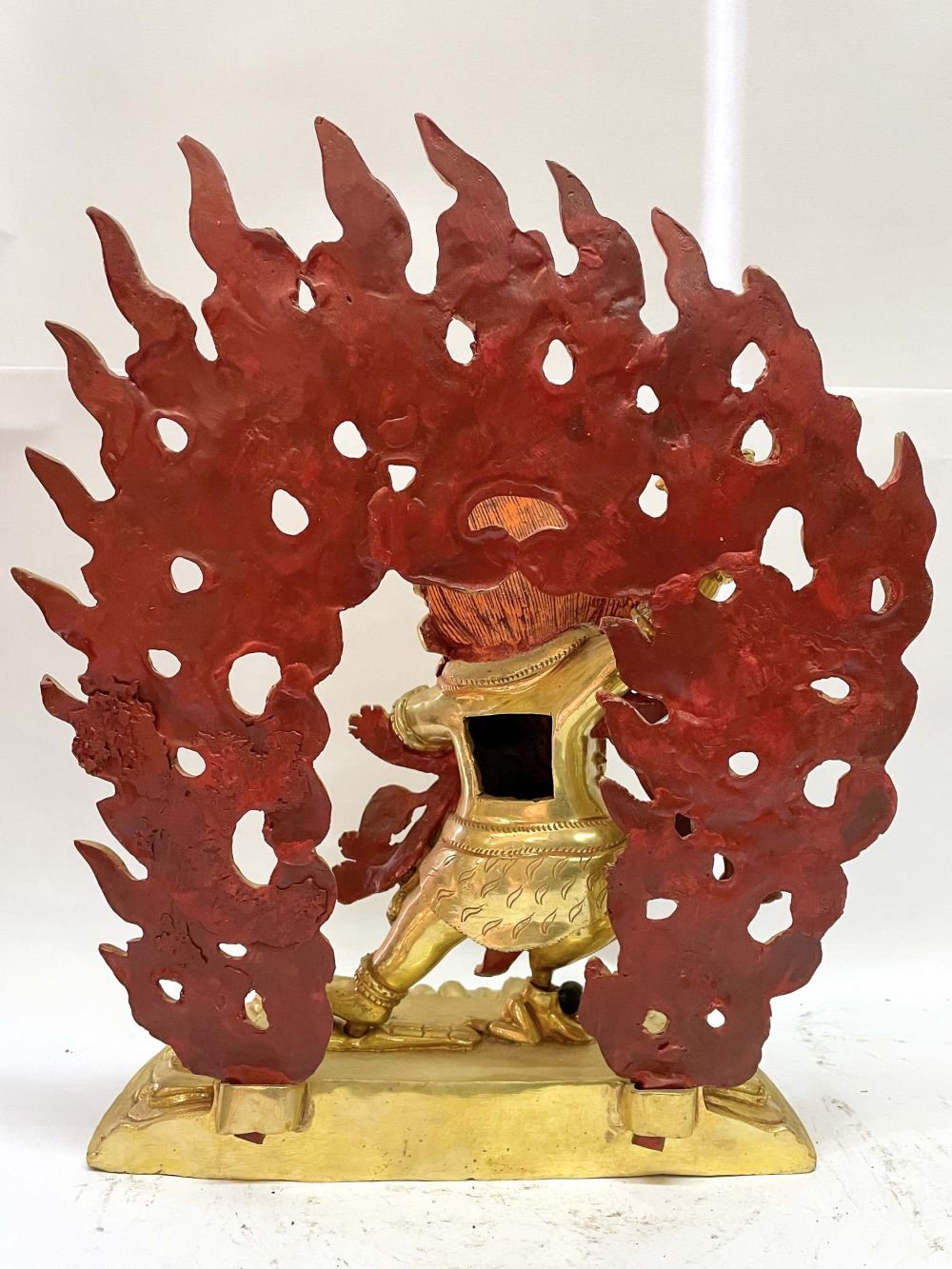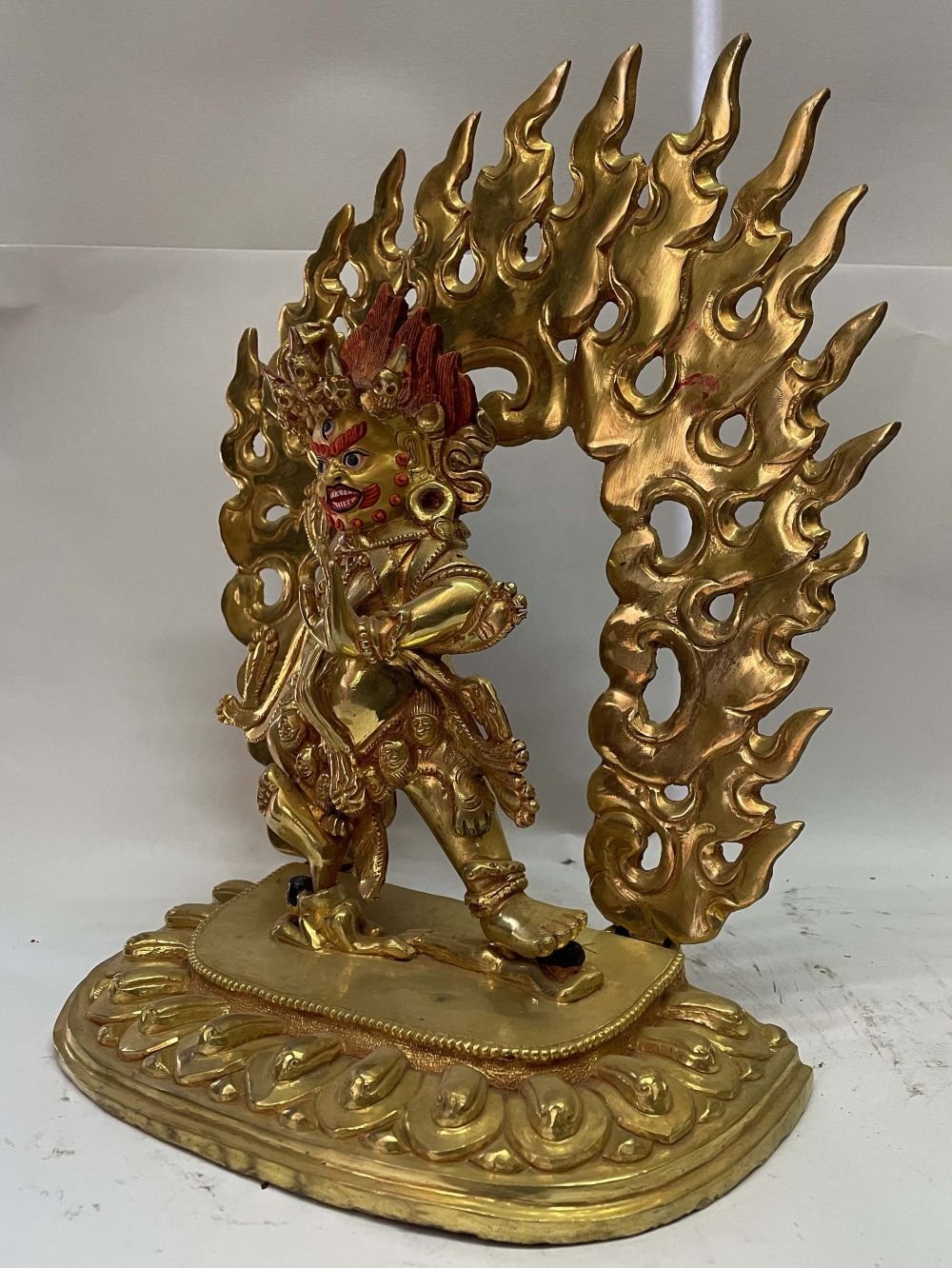 The face of Vajrapani is painted with gold to enhance its significant features, particularly the eyes, and lips. This detailed painting is essential as it brings forth the crucial attributes of the expression of eyes and lips that metal carving alone cannot capture.