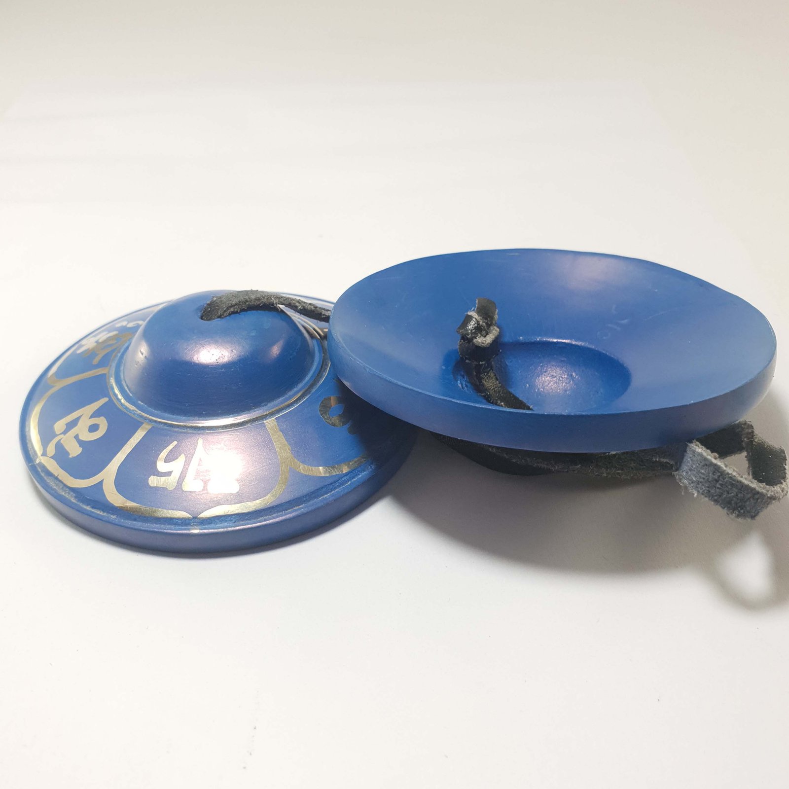 Bronze Tingsha - Om Lotus Painted Blue , A pair of cymbals used in Tibetan Buddhism for rituals, meditation, and sound healing