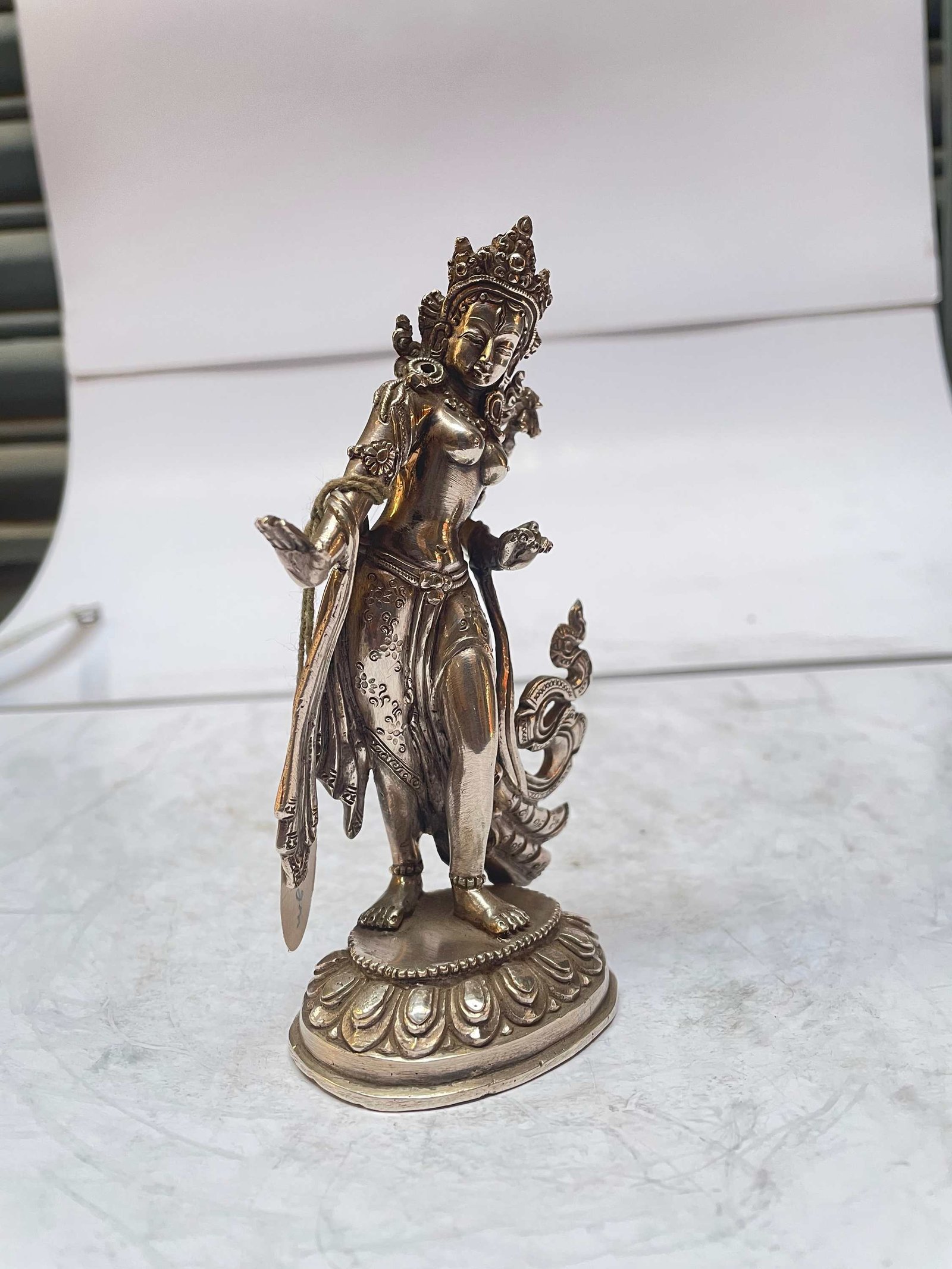 : About Silver Statue:The Silver Statues are rarely made these days, This White Tara statue date back to the late 1990 A.D. Most of the statues in our collection are highly collectibles because the silver statues were rarely found even though the prices were cheap during the late 1990 and early 2000. In this present era, the price of silver has hicked so much that making a silver statue for a commercial purpose is not viable anymore. The price we have offered for the statues are comparatively than of making a new one.