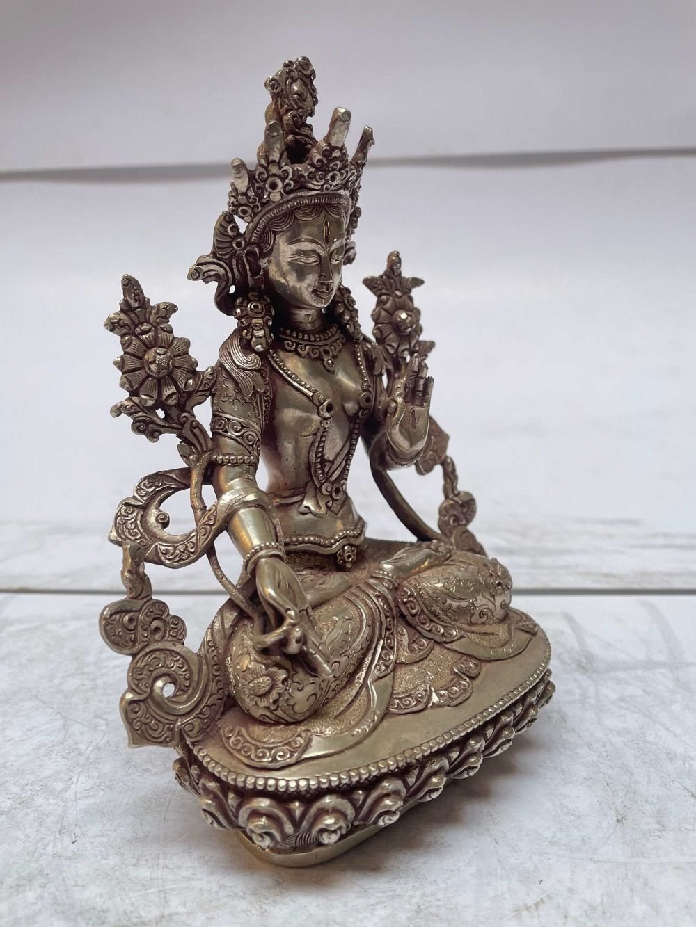 : About Silver Statue:The Silver Statues are rarely made these days, This White Tara statue date back to the late 1990 A.D. Most of the statues in our collection are highly collectibles because the silver statues were rarely found even though the prices were cheap during the late 1990 and early 2000. In this present era, the price of silver has hicked so much that making a silver statue for a commercial purpose is not viable anymore. The price we have offered for the statues are comparatively than of making a new one.
