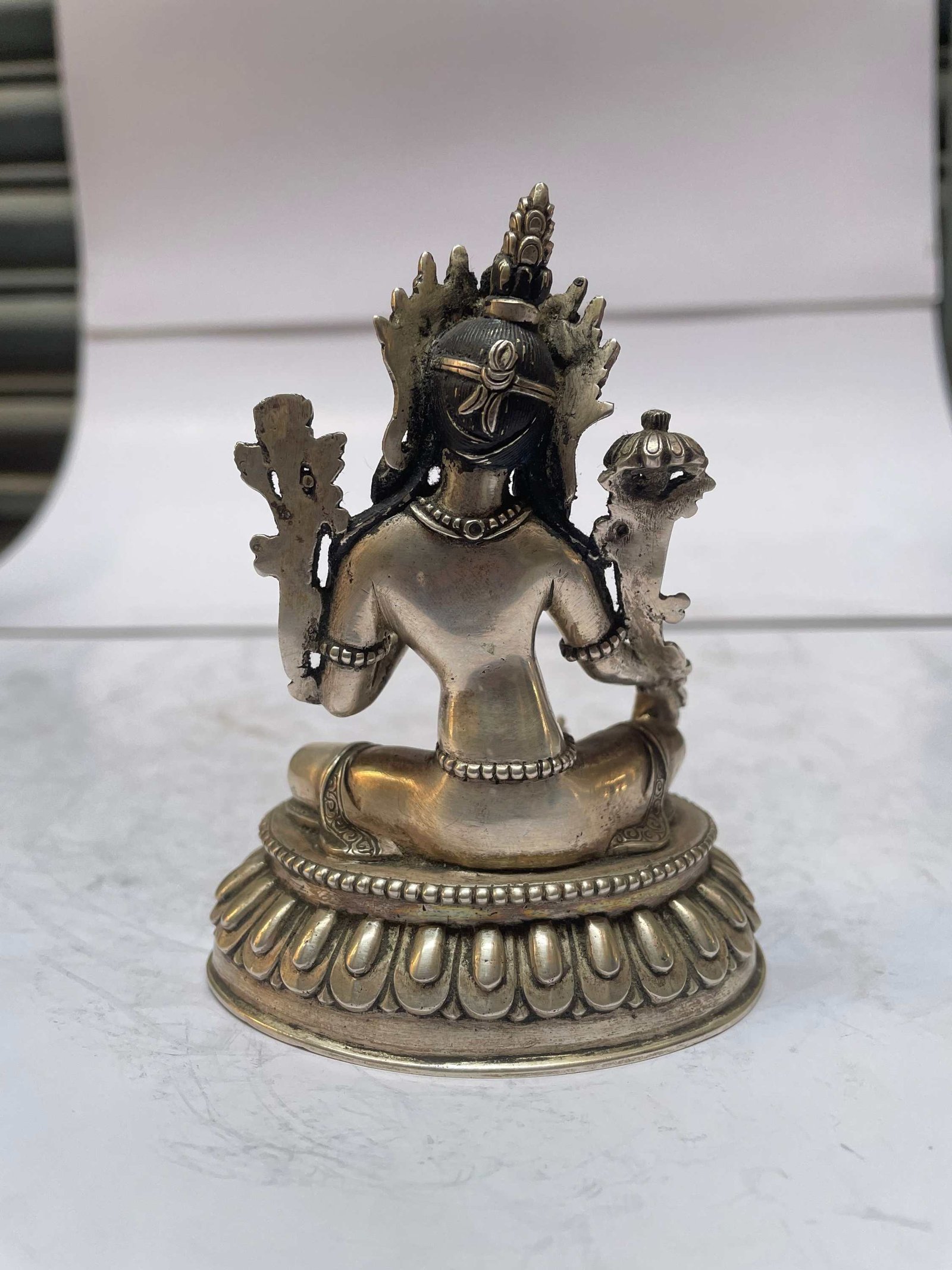 : About Silver Statue:The Silver Statues are rarely made these days, This Green Tara statue date back to the late 1990 A.D. Most of the statues in our collection are highly collectibles because the silver statues were rarely found even though the prices were cheap during the late 1990 and early 2000. In this present era, the price of silver has hicked so much that making a silver statue for a commercial purpose is not viable anymore. The price we have offered for the statues are comparatively than of making a new one.