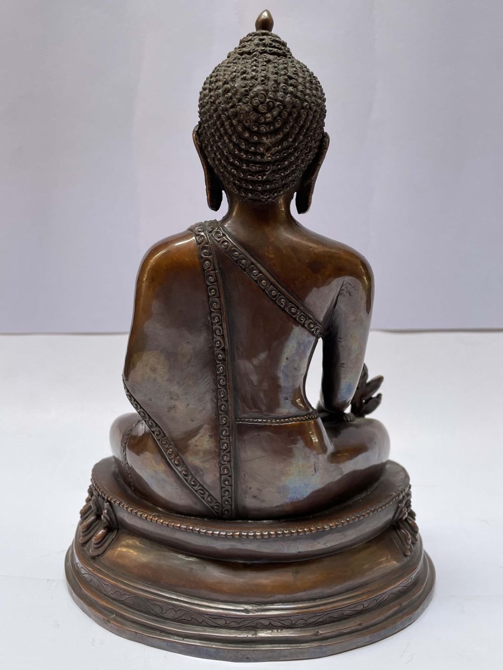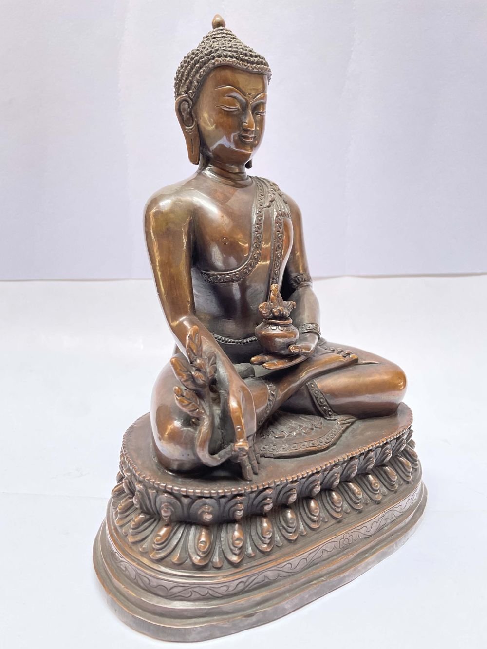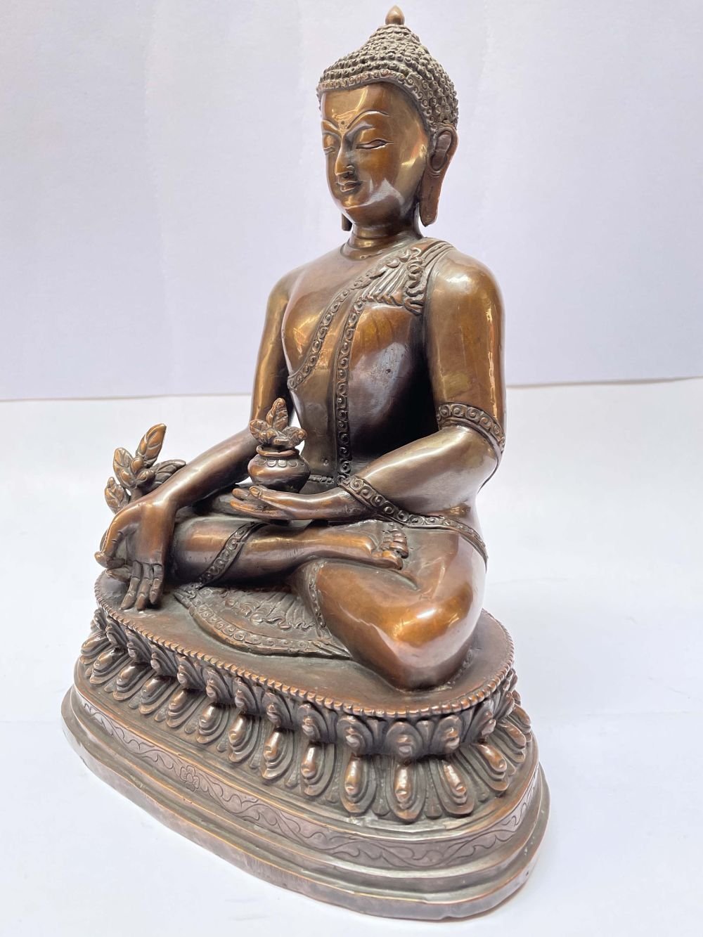This Medicine Buddha has been meticulously treated with a chocolate color antique patina. The intention behind this patina is to replicate the appearance of a copper statue that has gracefully aged over a century. Unlike a simple coat of paint, this patina is not applied superficially and is designed to endure. It undergoes an artificial oxidation process that adds depth and character, while also serving as a protective layer against natural oxidation.