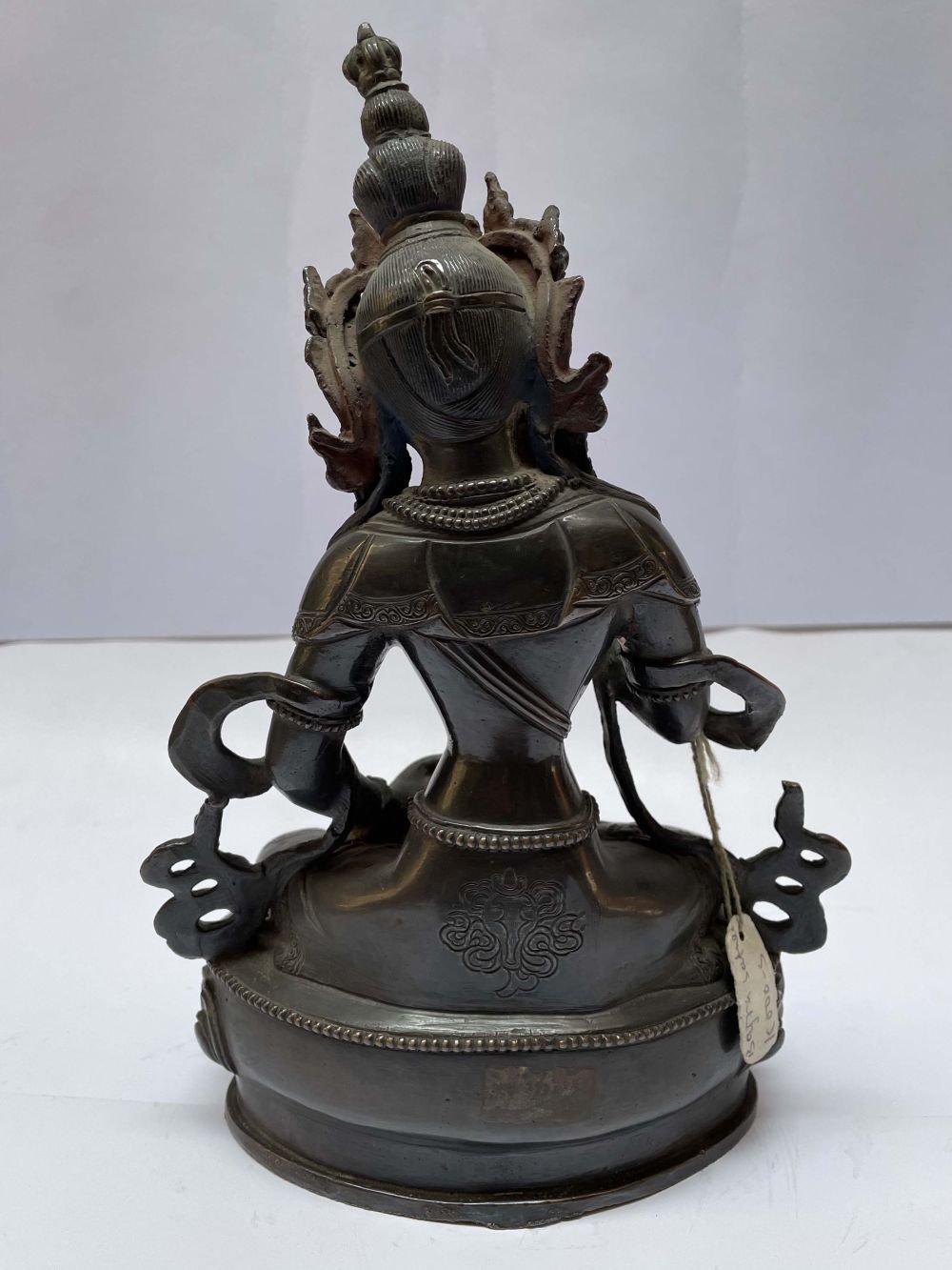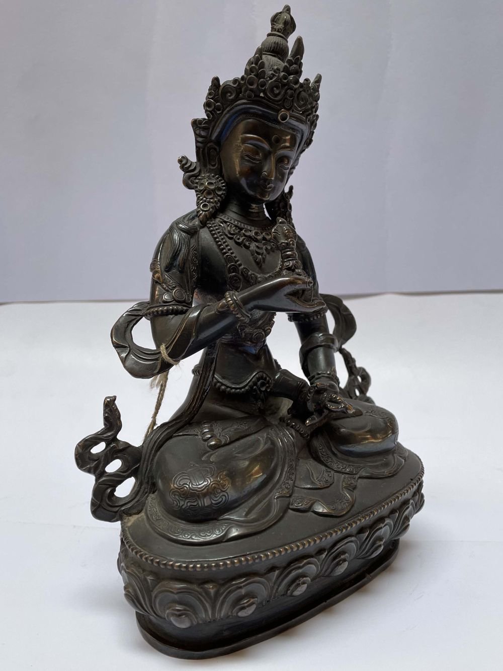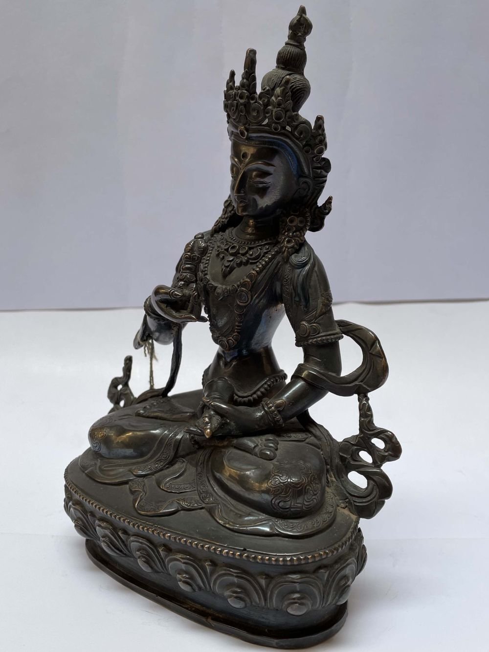 This is an antique patina-finished Vajrasattva. This is not an antique statue. It is just an antique patina finish. This Vajrasattva is a testament to the artisan's mastery of the art of aging. Its antique patina has been meticulously crafted to give the appearance of an aged statue, showcasing the artist's unique techniques and skills. Through undisclosed processes and careful aging treatments, the Vajrasattva undergoes a transformation that captures the essence of time and history. Read More