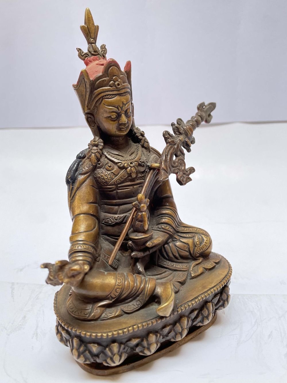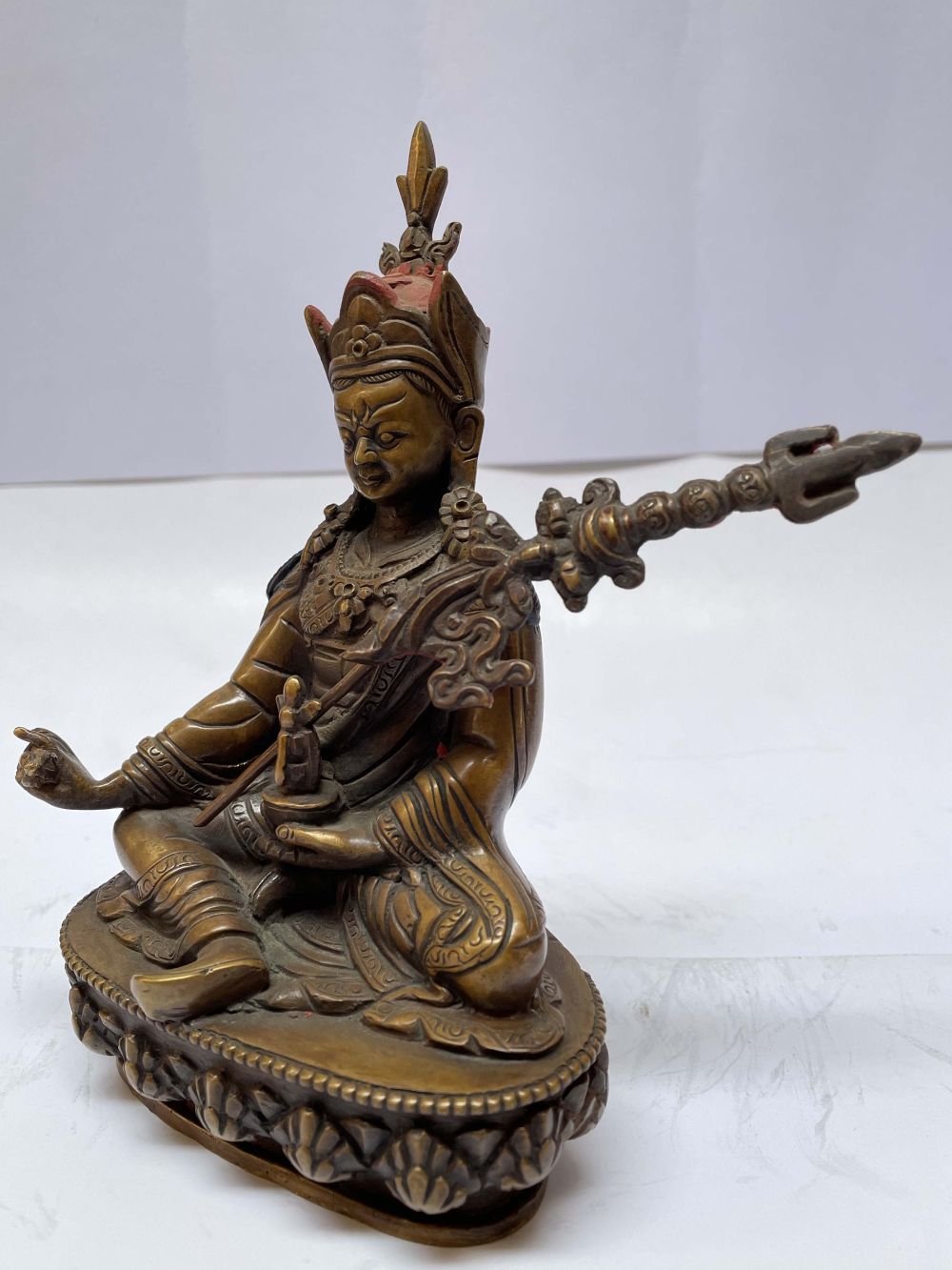 shirt, pants and heavy Tibetan boots, as protection against the cold. He holds the diamond-scepter of compassionate love in his right hand and the yogi's skull-bowl of clear wisdom in his left. He has a special trident called khatvanga of a wandering Yogi, and wears on his head a Nepalese cloth crown, stylistically designed to remind one of the shape of a lotus flower. Thus he is represented as he must have appeared in Tibet.