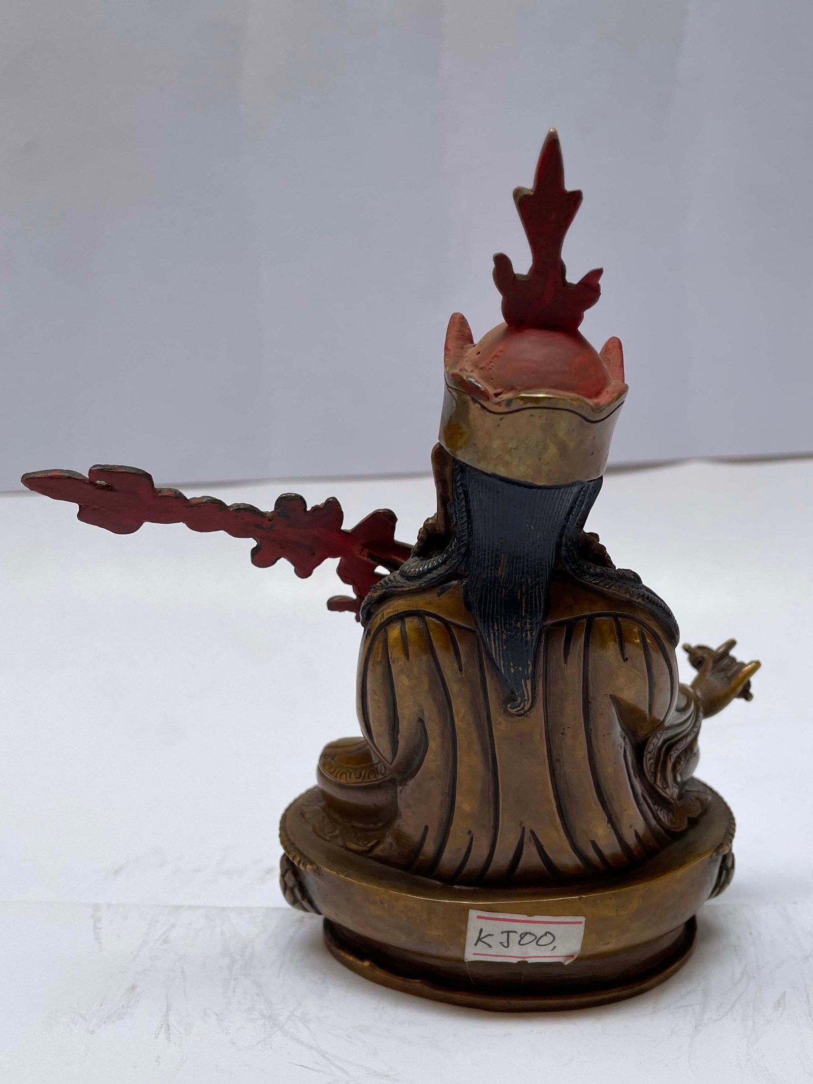 This Padmasambhava has been meticulously treated with a chocolate color antique patina. The intention behind this patina is to replicate the appearance of a copper statue that has gracefully aged over a century. Unlike a simple coat of paint, this patina is not applied superficially and is designed to endure. It undergoes an artificial oxidation process that adds depth and character, while also serving as a protective layer against natural oxidation.