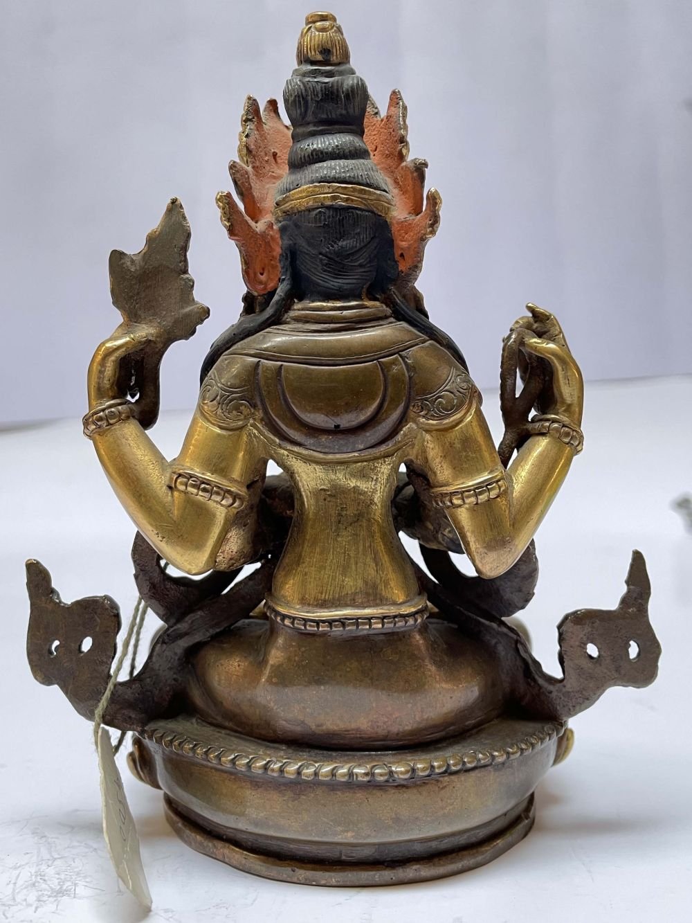 This Chenrezig has a Partly gold-plated finish. Partly fire gold gilding, a common practice in Nepali handicrafts. This technique is skillfully employed by artisans to create intricate designs on various metal objects, including statues, jewelry, and decorative items. Through a process, a mask or resist is applied to safeguard specific areas from the gold plating. The object is then subjected to high temperatures, allowing the gold to beautifully adhere to exposed surfaces using a combination of heat and pressure.
