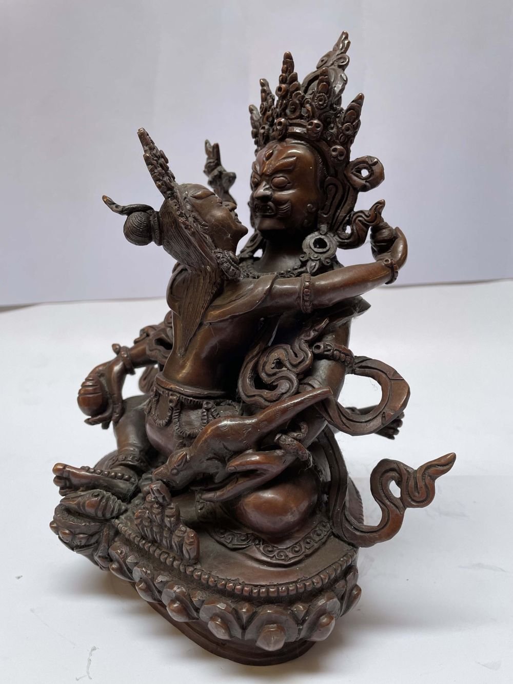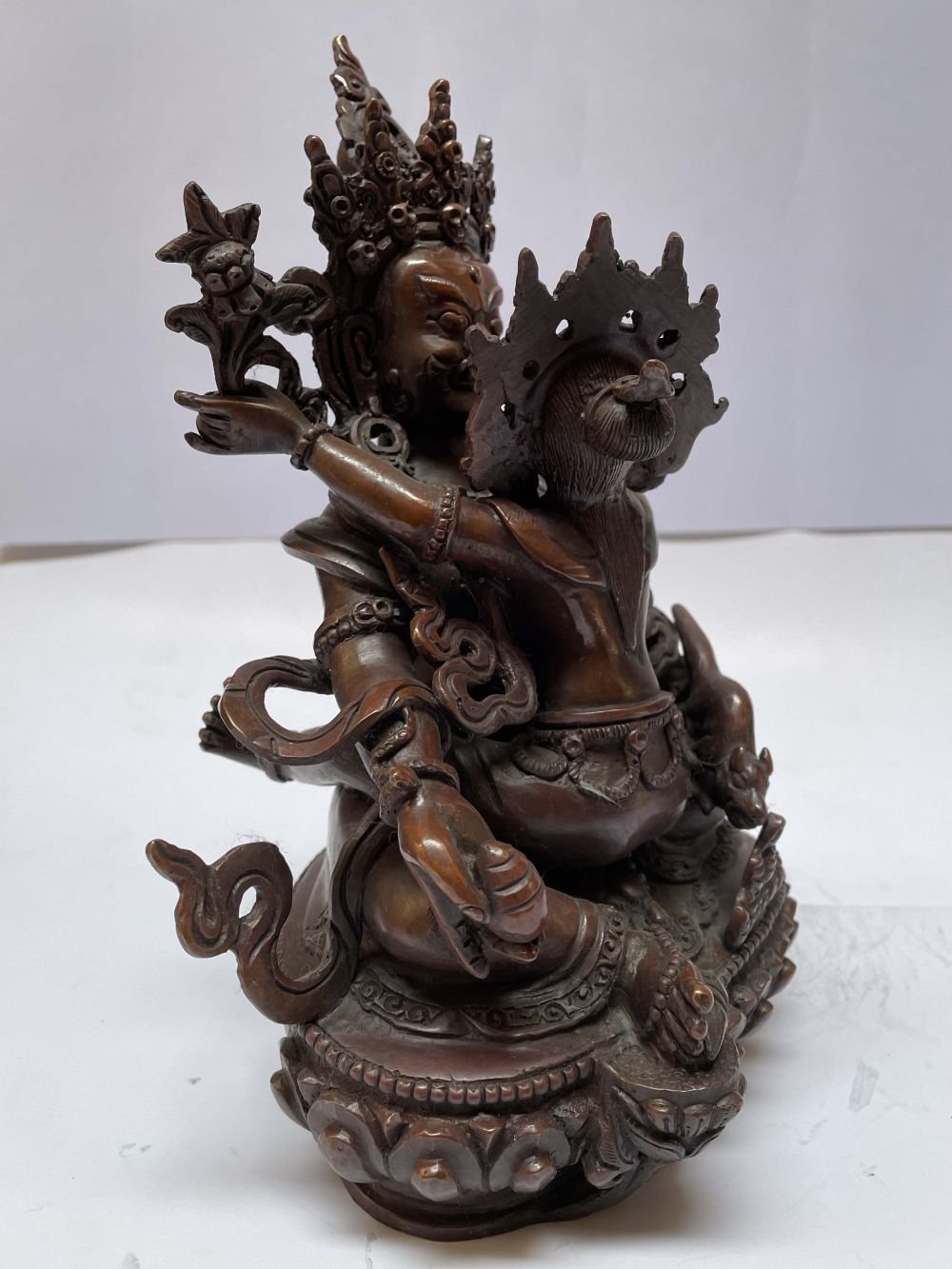 This Yellow Jambhala has been meticulously treated with a chocolate color antique patina. The intention behind this patina is to replicate the appearance of a copper statue that has gracefully aged over a century. Unlike a simple coat of paint, this patina is not applied superficially and is designed to endure. It undergoes an artificial oxidation process that adds depth and character, while also serving as a protective layer against natural oxidation.