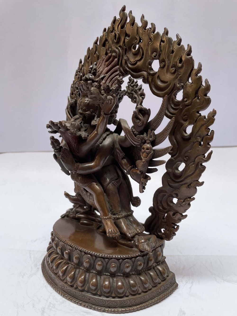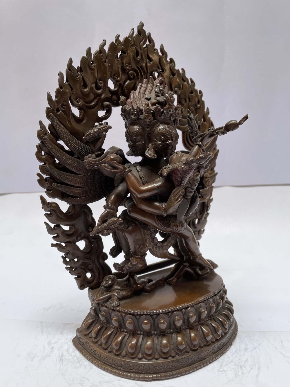 This Vajrakilaya has been meticulously treated with a chocolate color antique patina. The intention behind this patina is to replicate the appearance of a copper statue that has gracefully aged over a century. Unlike a simple coat of paint, this patina is not applied superficially and is designed to endure. It undergoes an artificial oxidation process that adds depth and character, while also serving as a protective layer against natural oxidation.