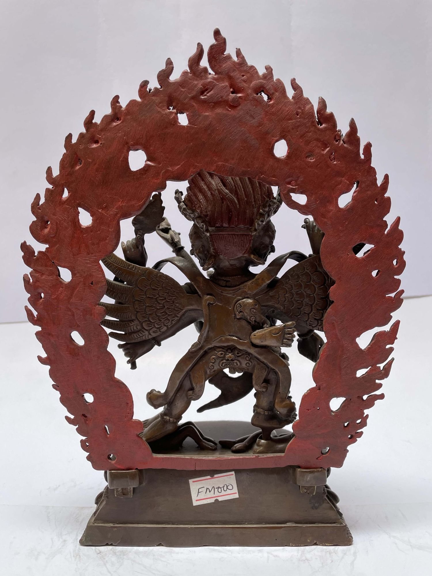 Vajrakila's two top left hands both hold Vajra sceptres. The upper nine pronged [often open pronged] sceptre signifies his wrathful aspect, the smaller lower sceptre his peaceful nature. Vajrakila's top right hand is in threatening Tarjani hand gesture [Skt. mudra] with the index finger raised releasing a blaze of wisdom fire. His middle right-hand brandishes a trident [Skt. trisula] with three severed & impaled heads in deteriorating stages of decay. [The top having become a skull]. The blue head represents hatred, the redhead greed & the white skull the overriding cause of human suffering, delusion. His middle right-hand brandishes a small khartvanga trident. The staff is traditionally made of red sandalwood. The flame issuing from the middle prong [wisdom fire] symbolises the transmutation of the three principal causes of suffering into enlightened awareness. The white silk scarf depicts a funeral shroud that represents victory over the power of suffering death. He has two outstretched Garuda wings which represent his supremacy over the primordial underlying energy of the earth and her water. This subterranean energy is represented by naga serpents which the Garuda is held to have authority over. His association with primordial energy is also depicted in his horse neck, face whiskers, symbolic mane & similarity to Garuda-winged deity Hayagriva.