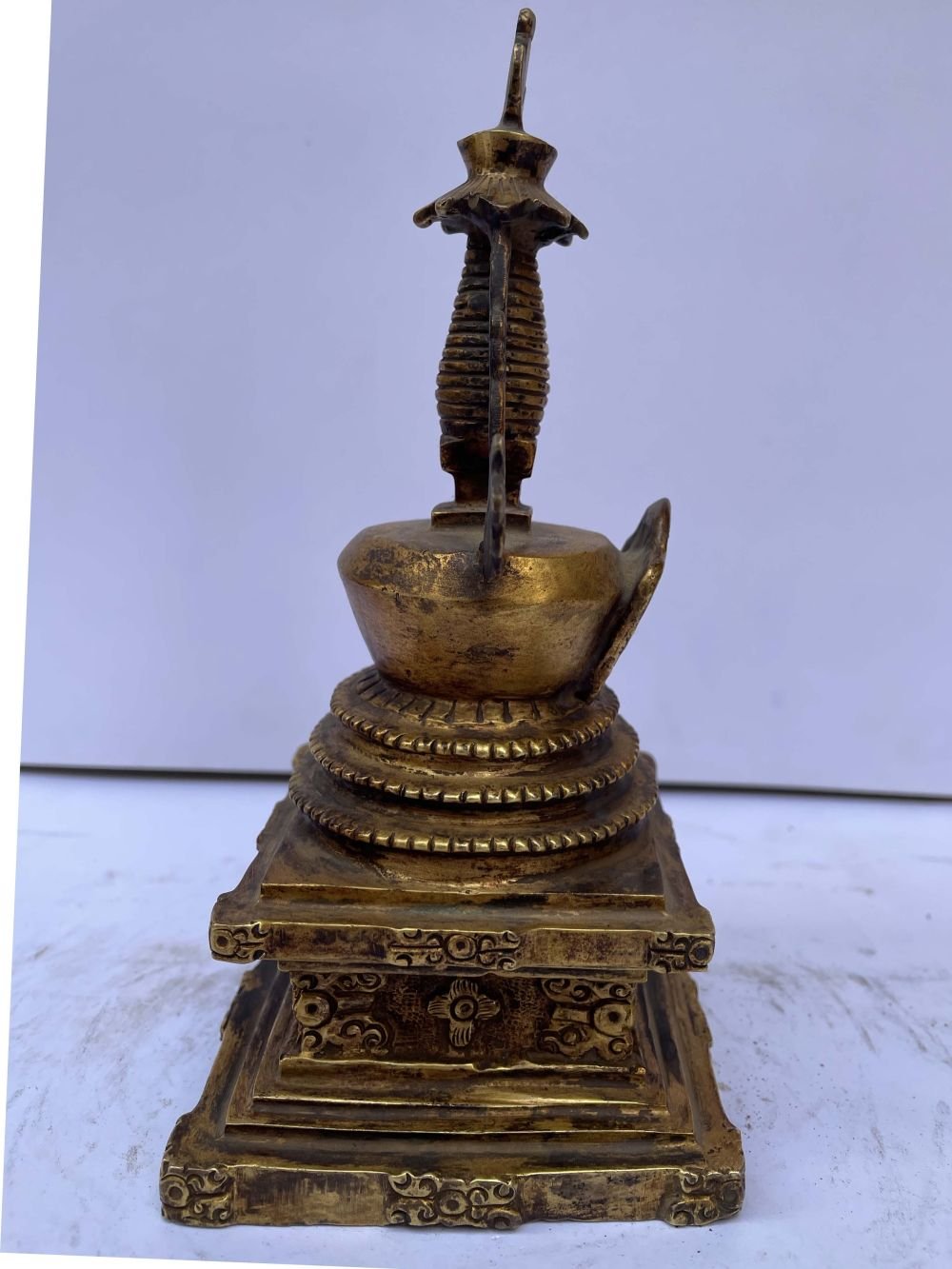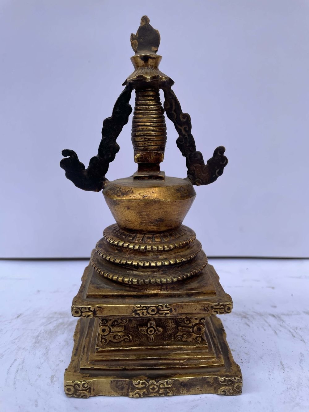 This is an antique patina-finished Eight Stupa. This is not an antique statue. It is just an antique patina finish. This Eight Stupa is a testament to the artisan's mastery of the art of aging. Its antique patina has been meticulously crafted to give the appearance of an aged statue, showcasing the artist's unique techniques and skills. Through undisclosed processes and careful aging treatments, the Eight Stupa undergoes a transformation that captures the essence of time and history. Read More