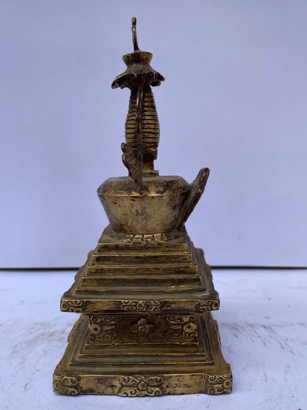 This is an antique patina-finished Eight Stupa. This is not an antique statue. It is just an antique patina finish. This Eight Stupa is a testament to the artisan's mastery of the art of aging. Its antique patina has been meticulously crafted to give the appearance of an aged statue, showcasing the artist's unique techniques and skills. Through undisclosed processes and careful aging treatments, the Eight Stupa undergoes a transformation that captures the essence of time and history. Read More
