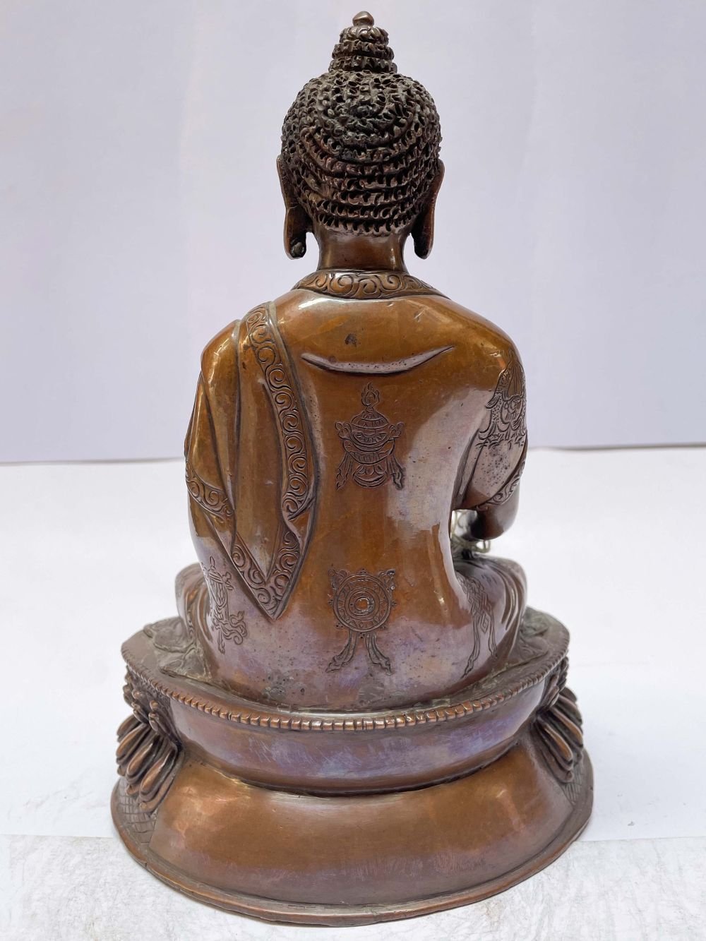 This Ratnasambhava Buddha has been meticulously treated with a chocolate color antique patina. The intention behind this patina is to replicate the appearance of a copper statue that has gracefully aged over a century. Unlike a simple coat of paint, this patina is not applied superficially and is designed to endure. It undergoes an artificial oxidation process that adds depth and character, while also serving as a protective layer against natural oxidation.