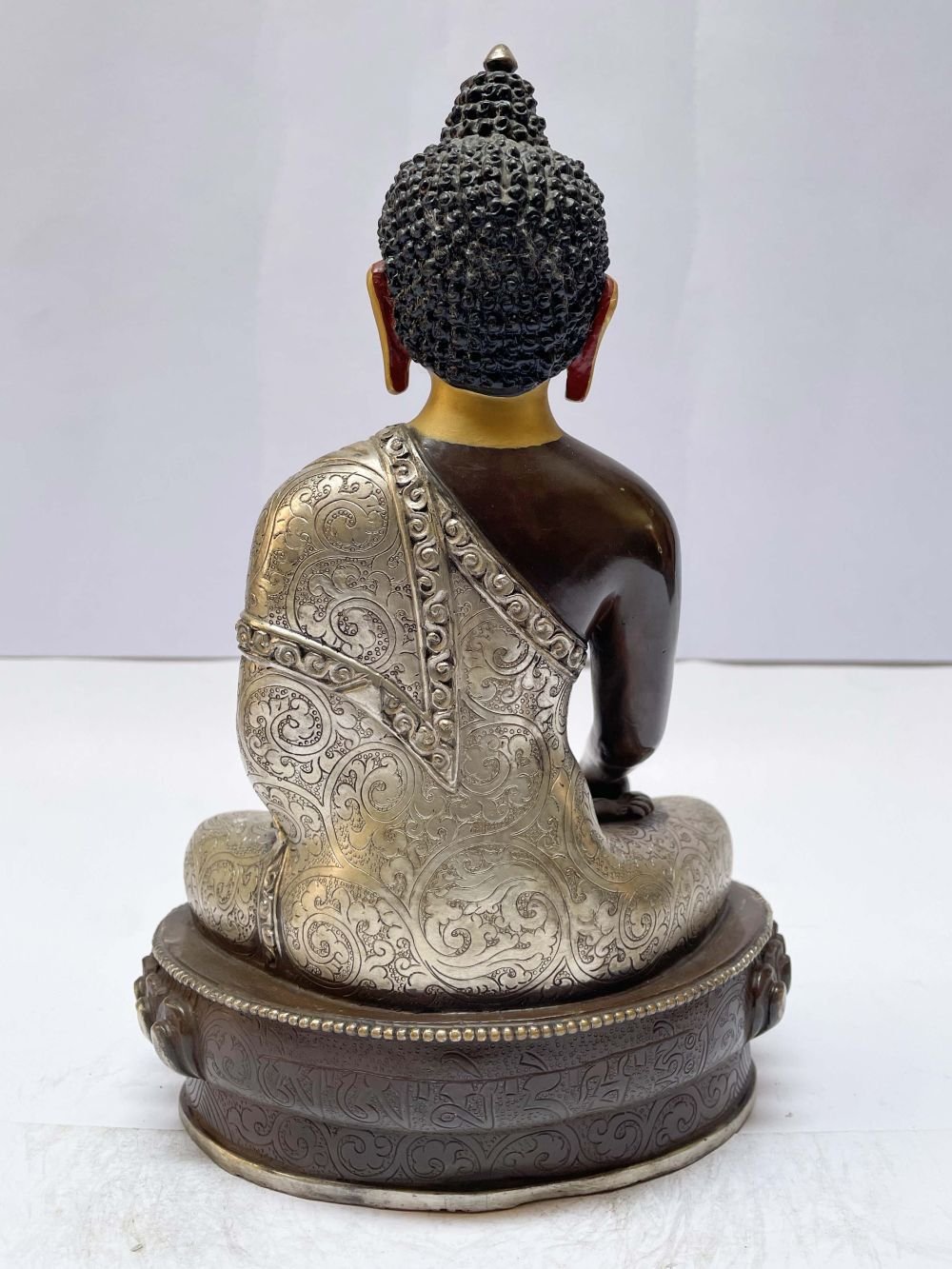 The Shakyamuni Buddha features a captivating combination of partly silver plating and dark oxidation. This unique finishing technique combines the lustrous shine of silver with the rich, deep tones achieved through oxidation. In the process of creating this finish, selected areas of the Shakyamuni Buddha are expertly silver-plated, creating a radiant and reflective surface that catches the light. The remaining areas are intentionally oxidized, resulting in a darkened patina that adds depth and character to the piece. Read More