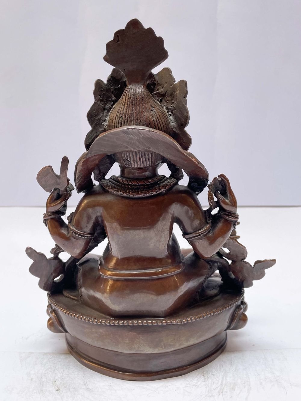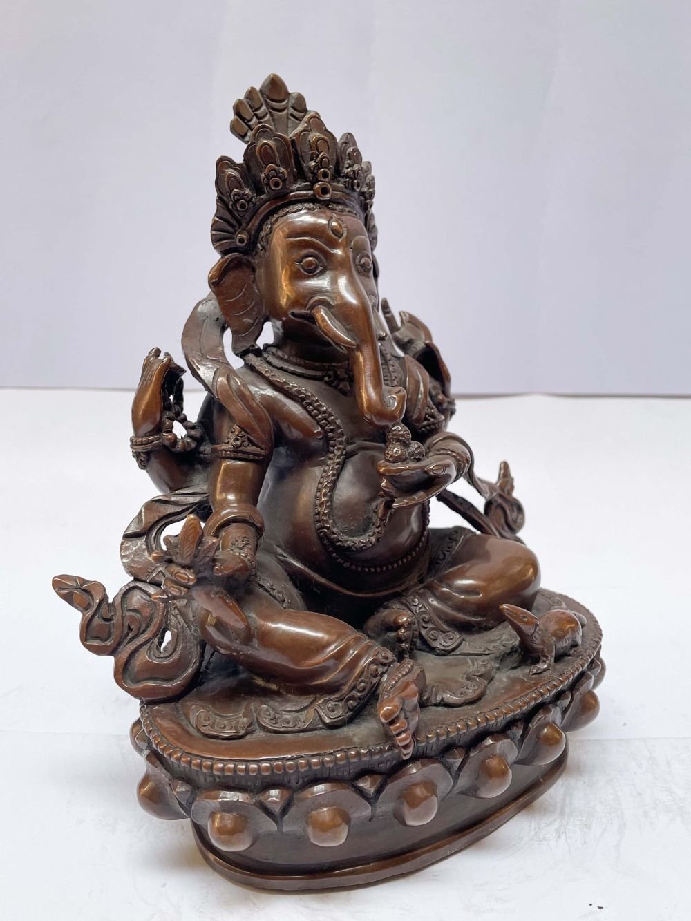 This Ganesh has been meticulously treated with a chocolate color antique patina. The intention behind this patina is to replicate the appearance of a copper statue that has gracefully aged over a century. Unlike a simple coat of paint, this patina is not applied superficially and is designed to endure. It undergoes an artificial oxidation process that adds depth and character, while also serving as a protective layer against natural oxidation.
