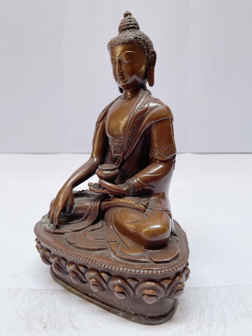 This Shakyamuni Buddha has been meticulously treated with a chocolate color antique patina. The intention behind this patina is to replicate the appearance of a copper statue that has gracefully aged over a century. Unlike a simple coat of paint, this patina is not applied superficially and is designed to endure. It undergoes an artificial oxidation process that adds depth and character, while also serving as a protective layer against natural oxidation.