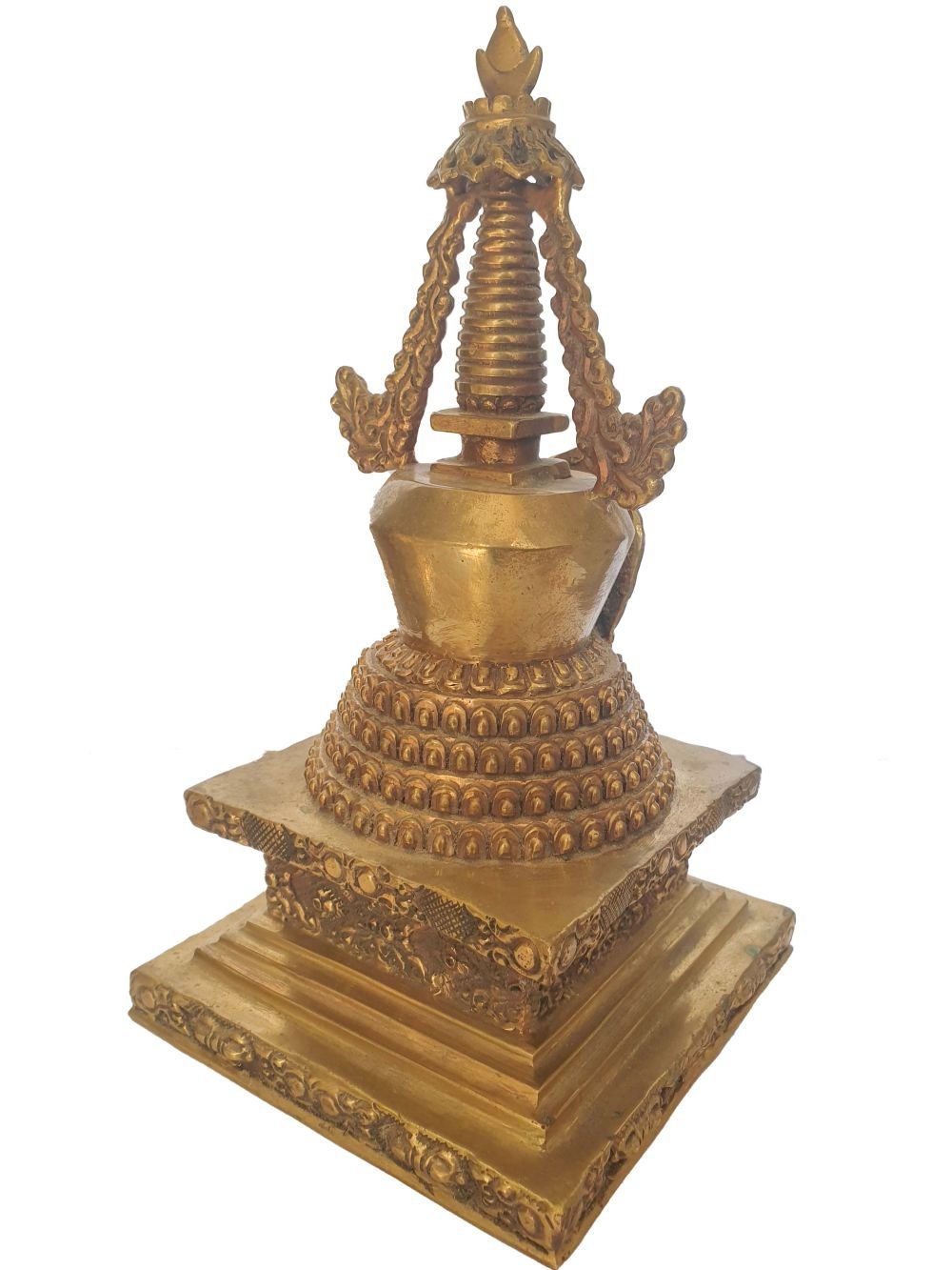 This Eight Stupa is made by the process of the Lost-Wax system. The lost-wax process, also known as investment casting, is a time-honored technique used to create metal sculptures. It involves several steps that have been practiced for thousands of years. Skilled artisans begin by sculpting a detailed wax model, capturing every intricate detail of the desired sculpture. The wax model is then coated with a ceramic shell, formed by multiple layers of ceramic material. Once the shell has cured, the wax is melted and drained out, leaving behind a cavity. Molten metal is poured into the cavity, creating a precise replica of the original wax model. After the metal has cooled and solidified, the ceramic shell is carefully removed, revealing the final metal sculpture. Read More